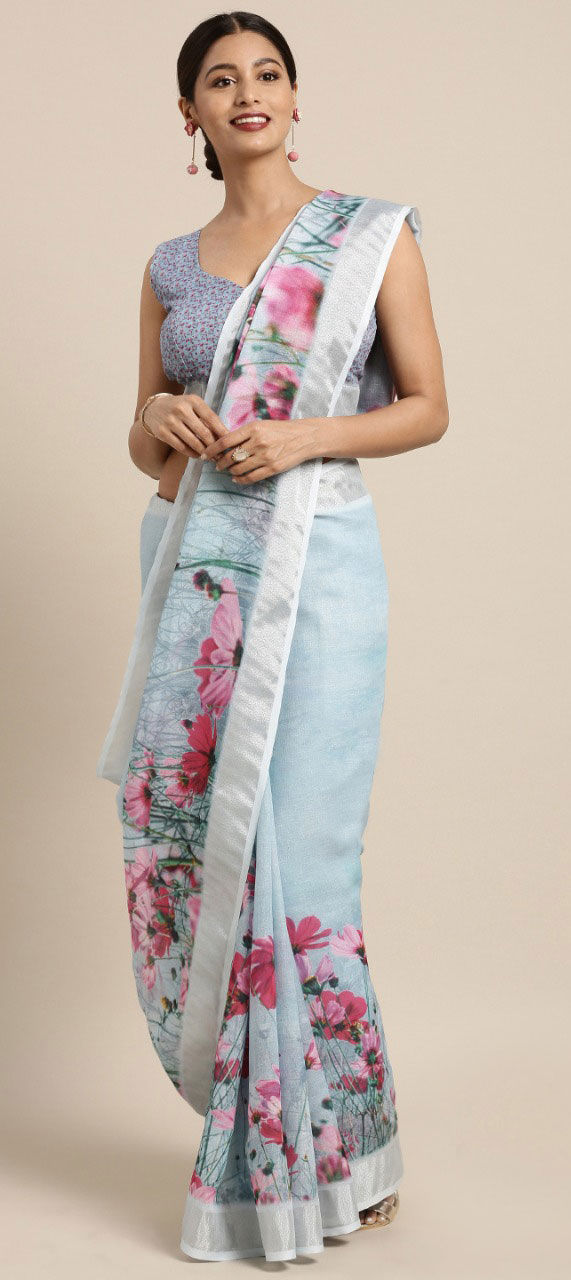 Blue color Saree in Cotton, Linen fabric with Floral, Printed work