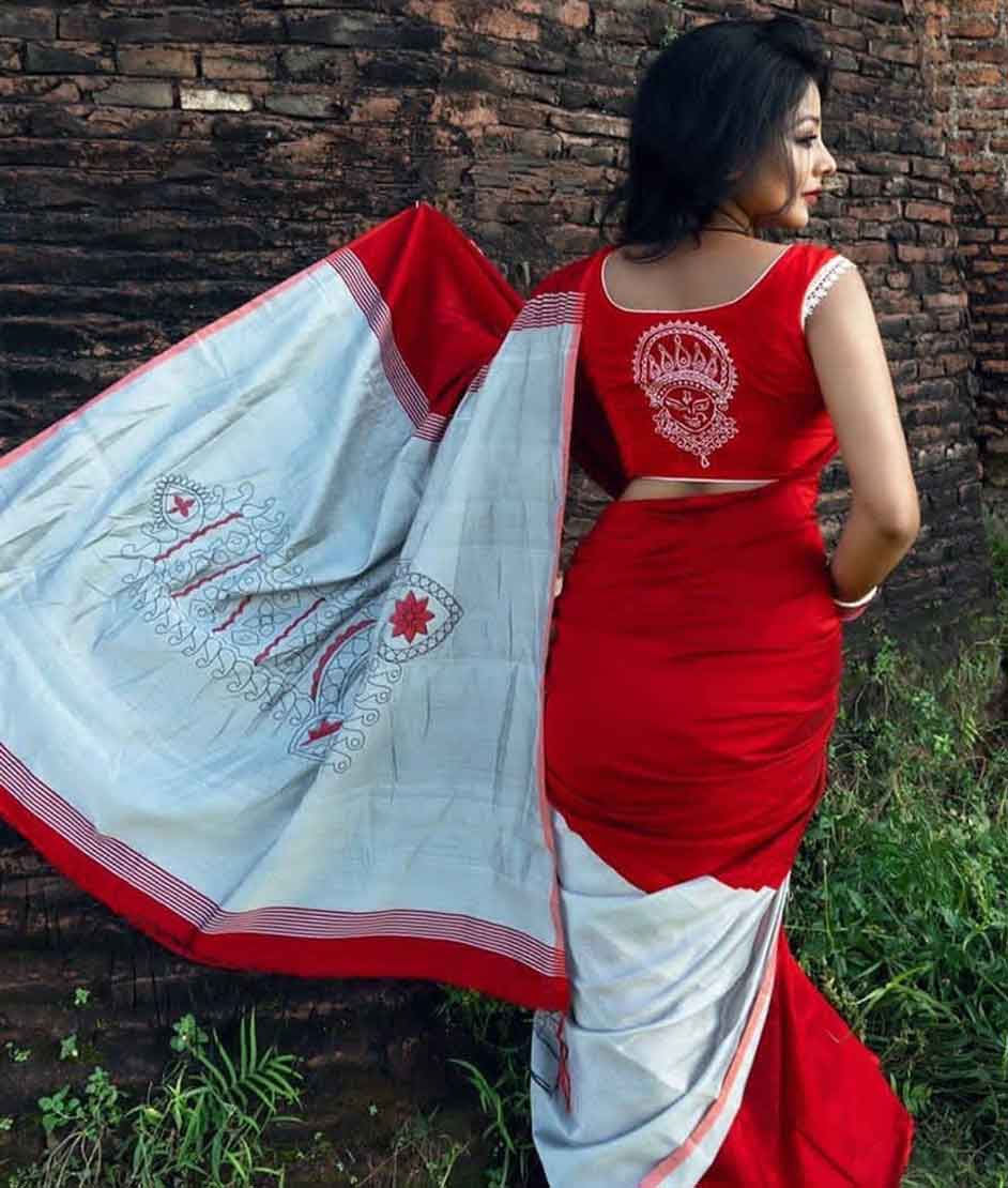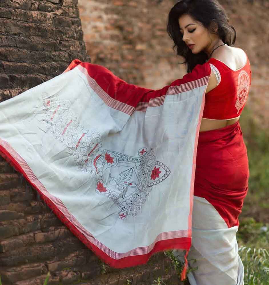Red and Maroon, White and Off White color Saree in Linen fabric with Digital Print work