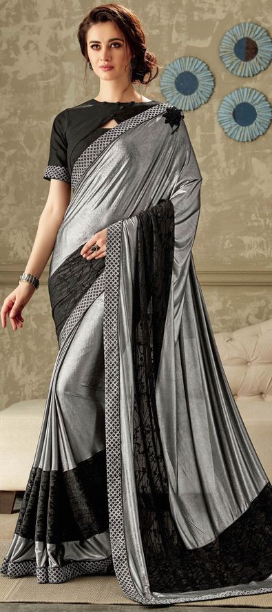 Black and Grey, Silver color Saree in Lycra fabric with Border, Stone work