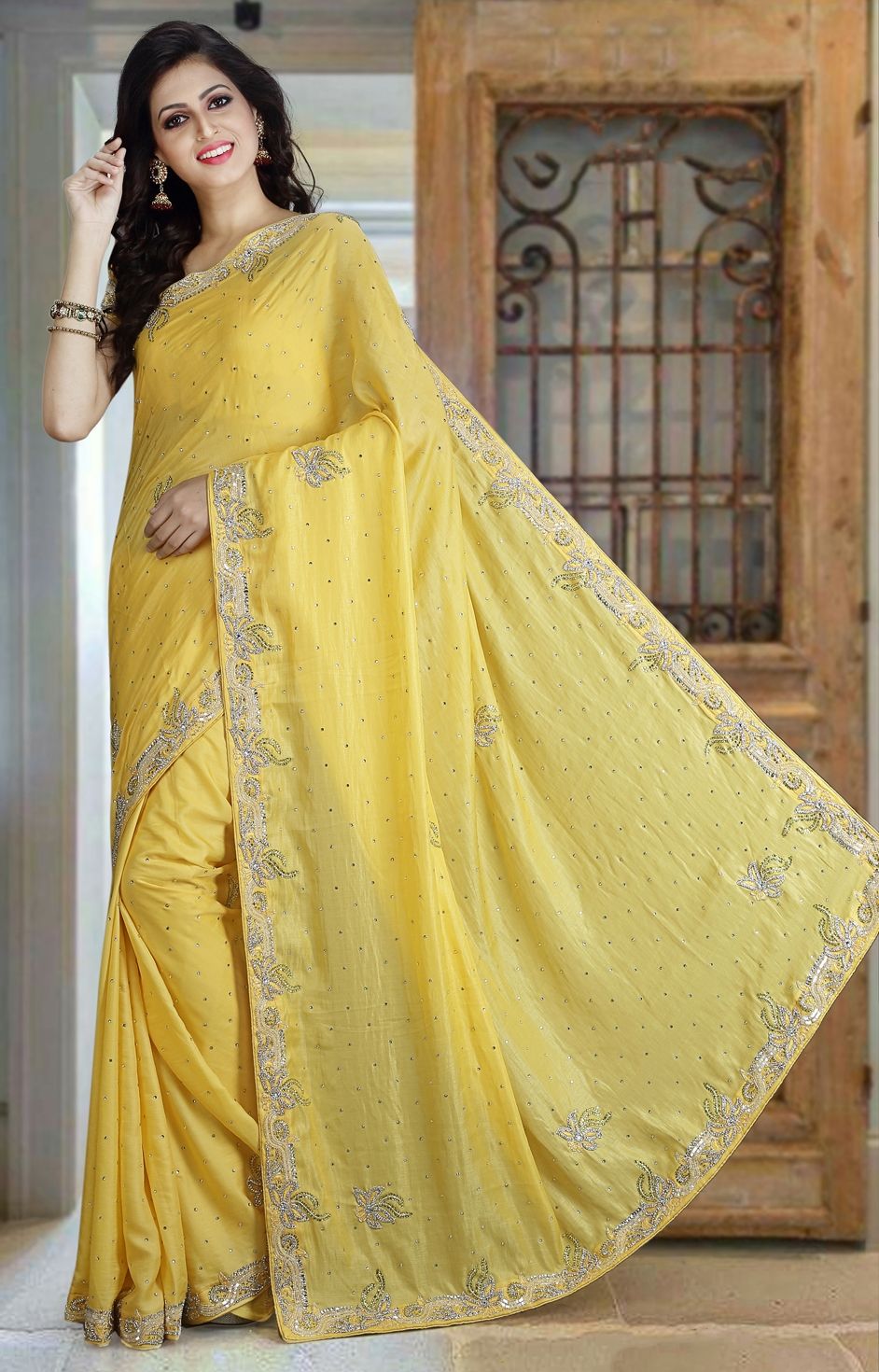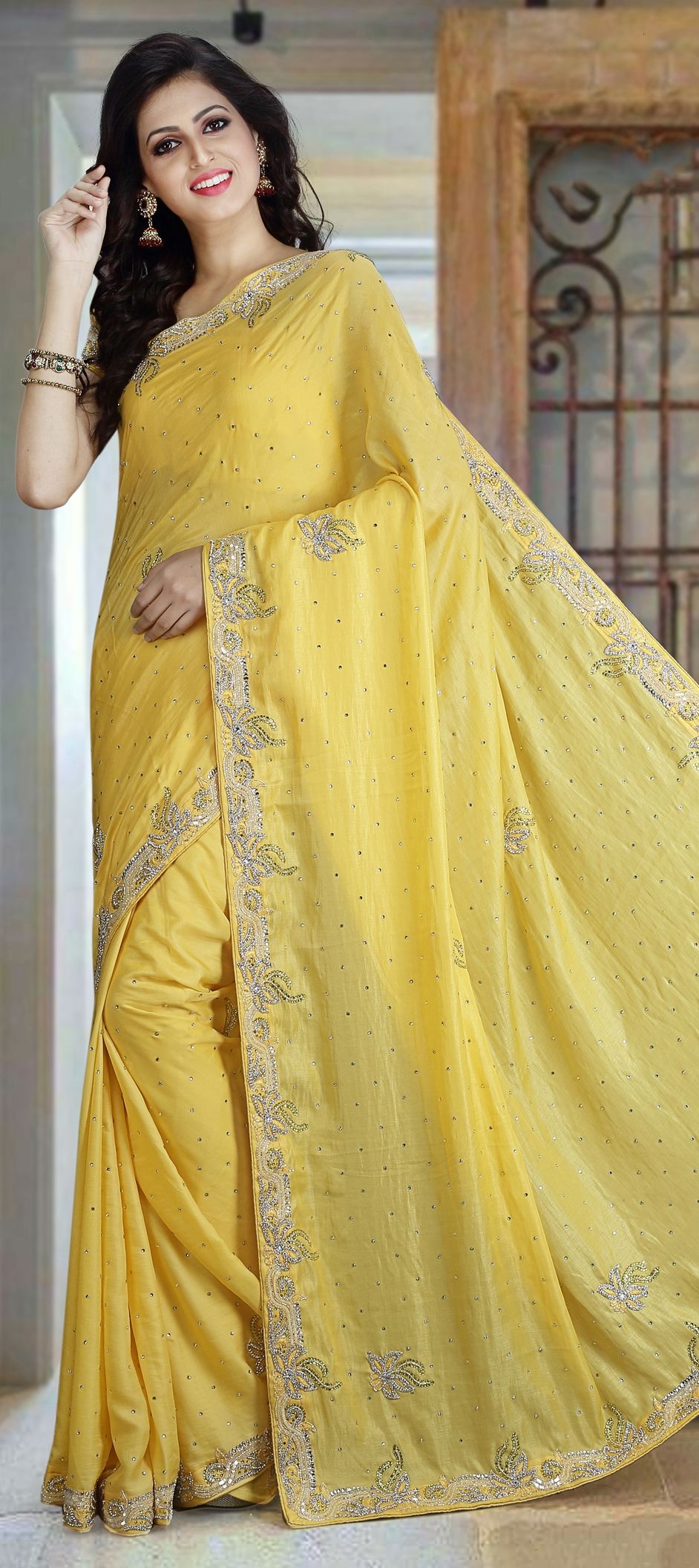 Yellow color Saree in Milan Silk fabric with Stone work