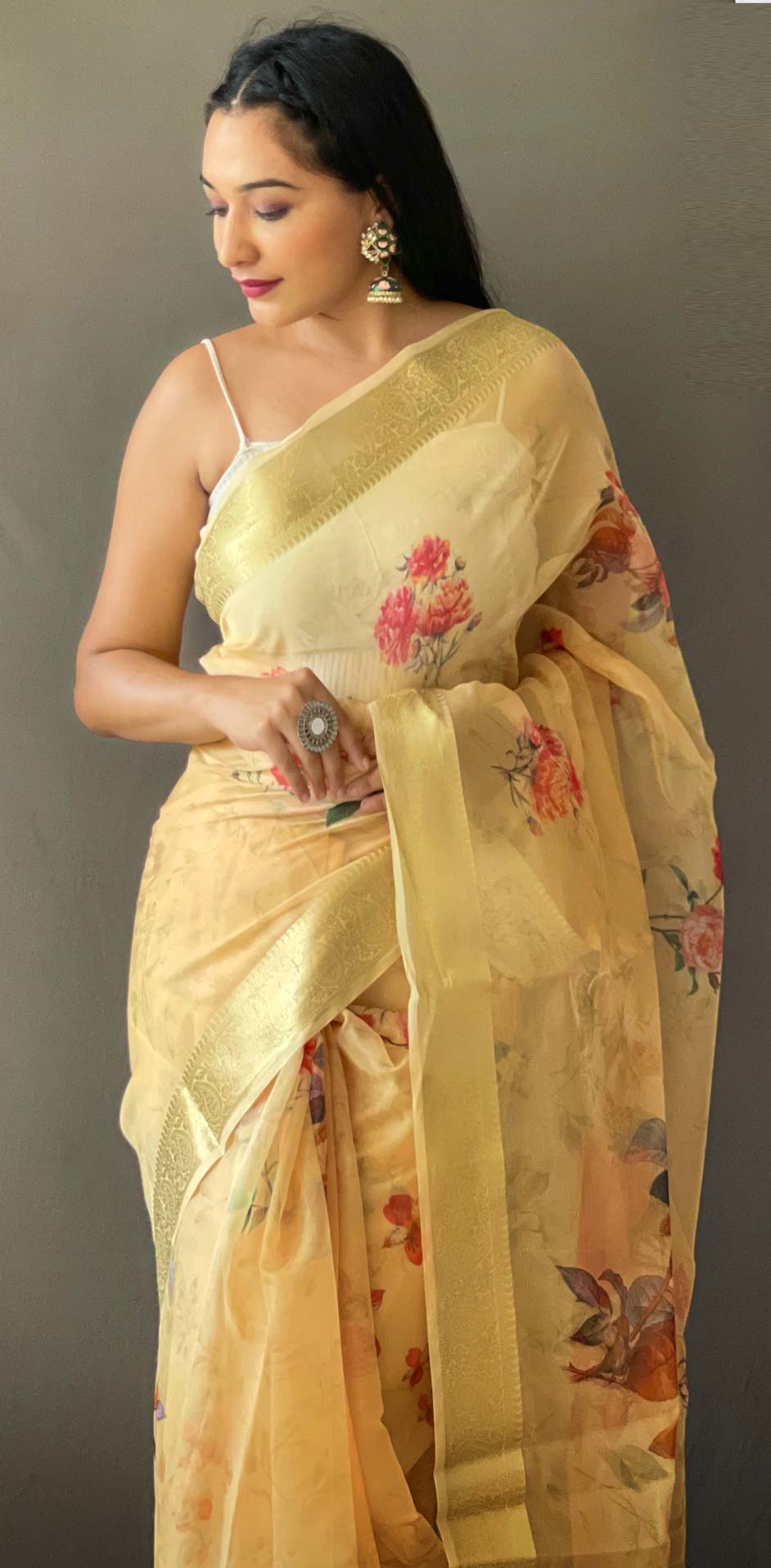 Beige and Brown color Saree in Organza Silk, Silk fabric with Floral, Printed work