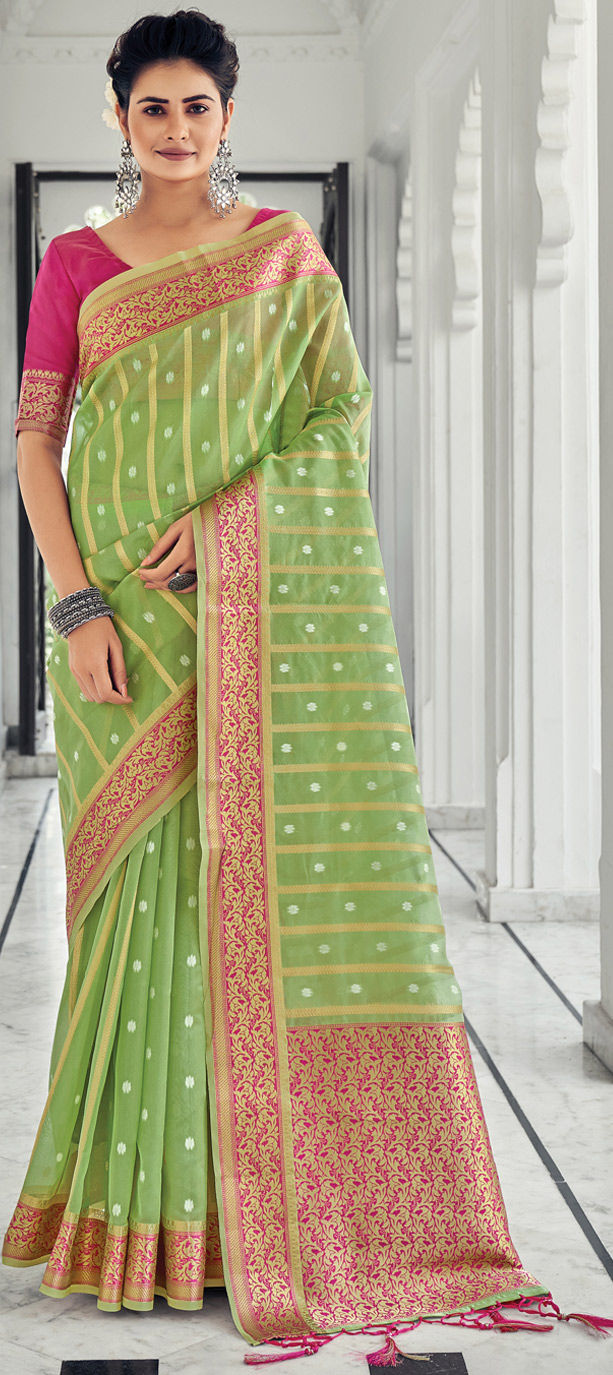 Green color Saree in Organza Silk, Silk fabric with Weaving work