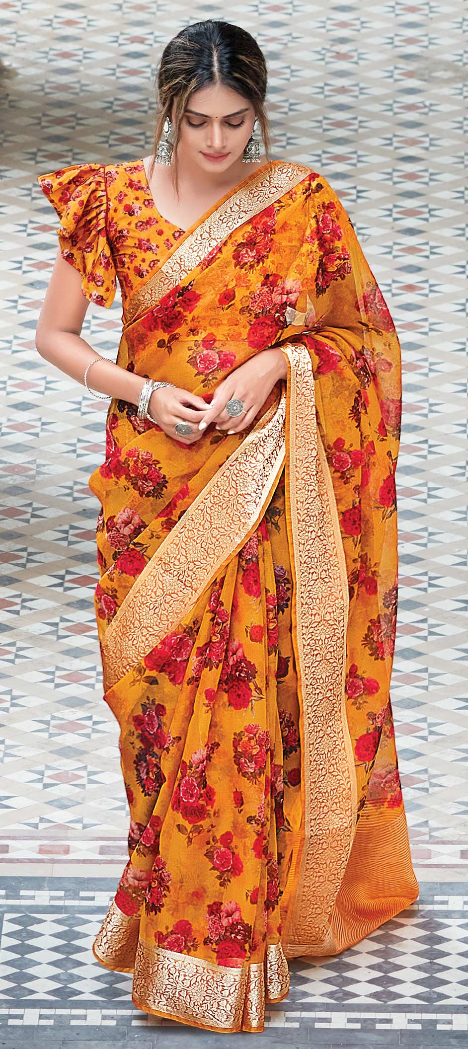 Orange color Saree in Organza Silk, Silk fabric with Digital Print work
