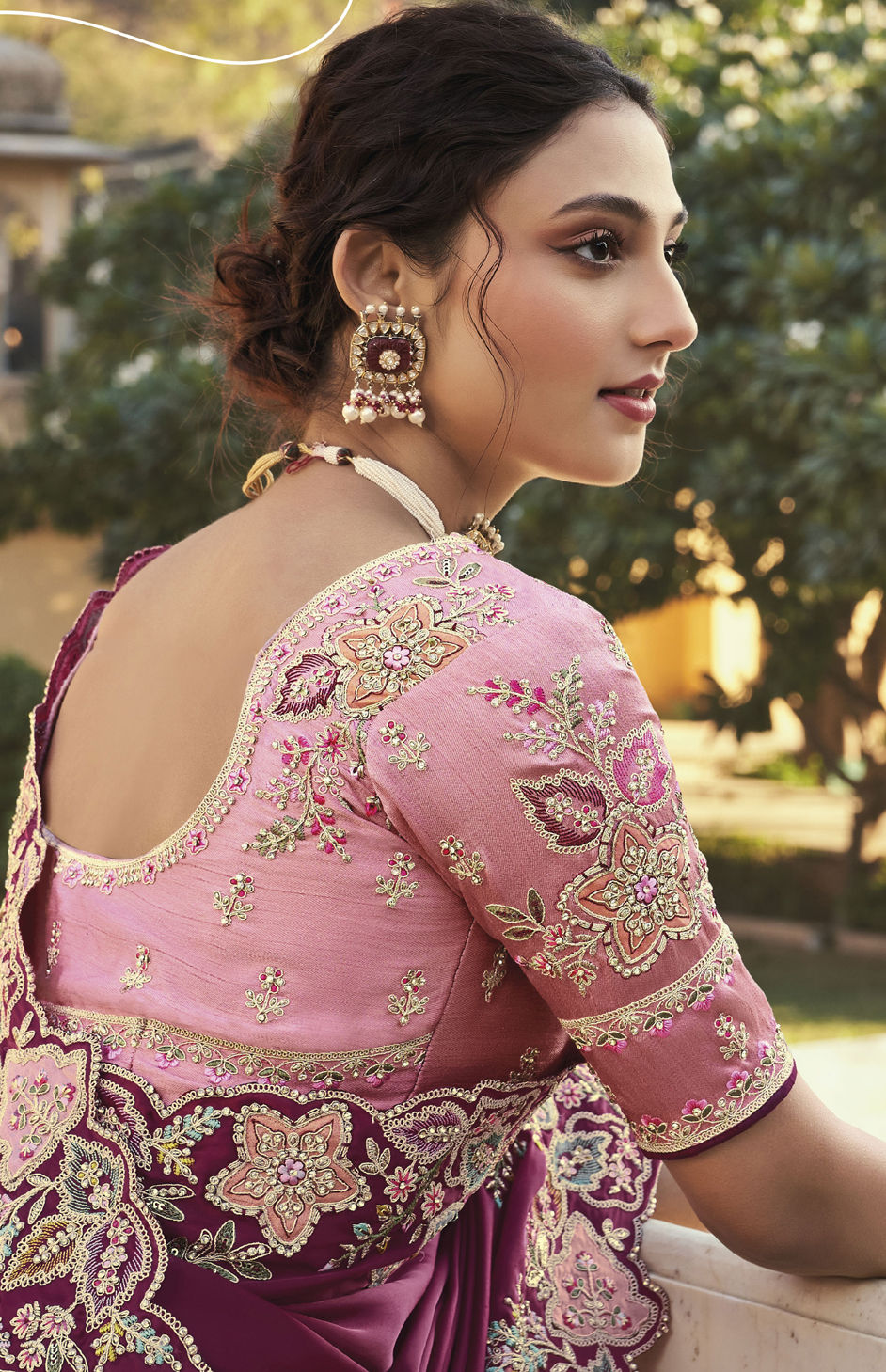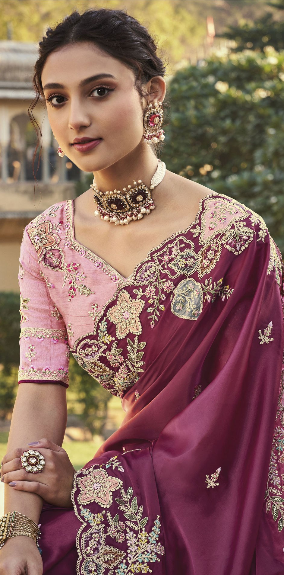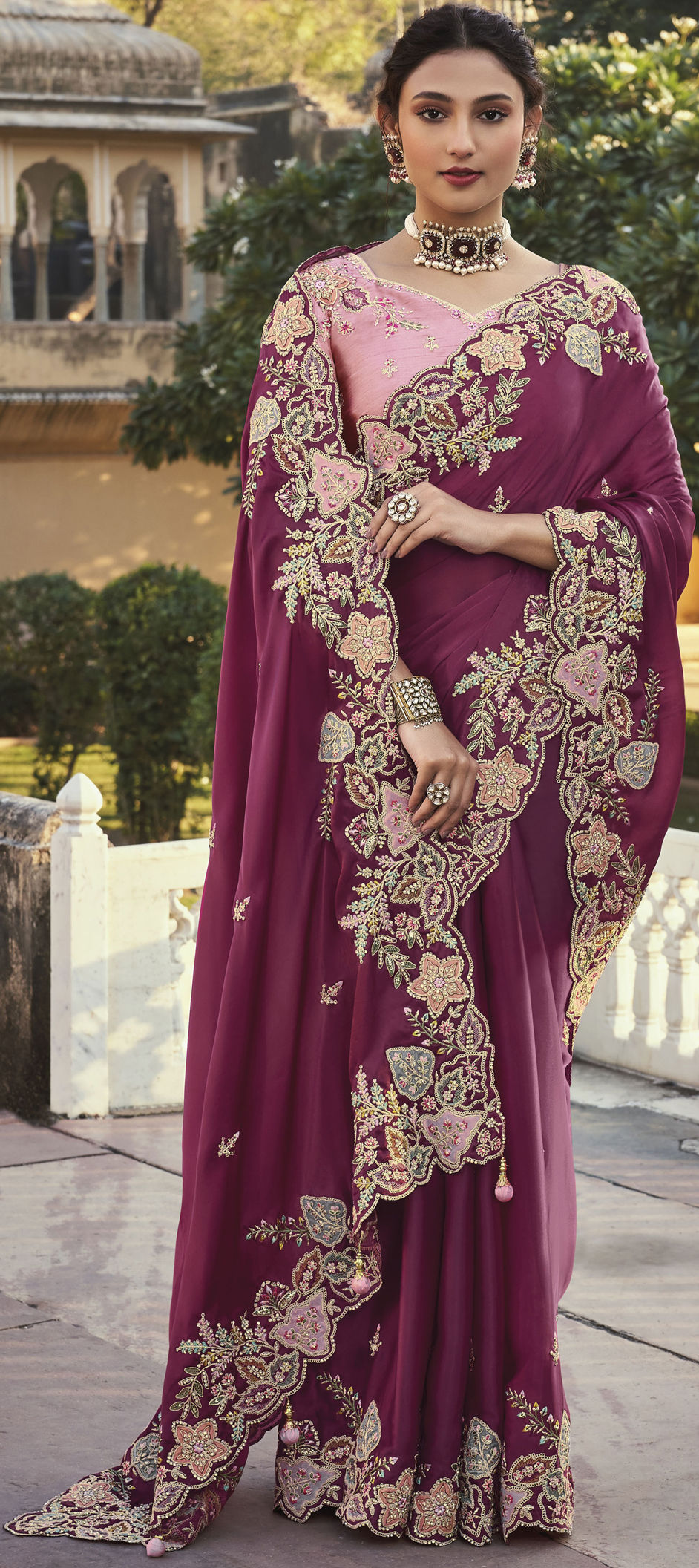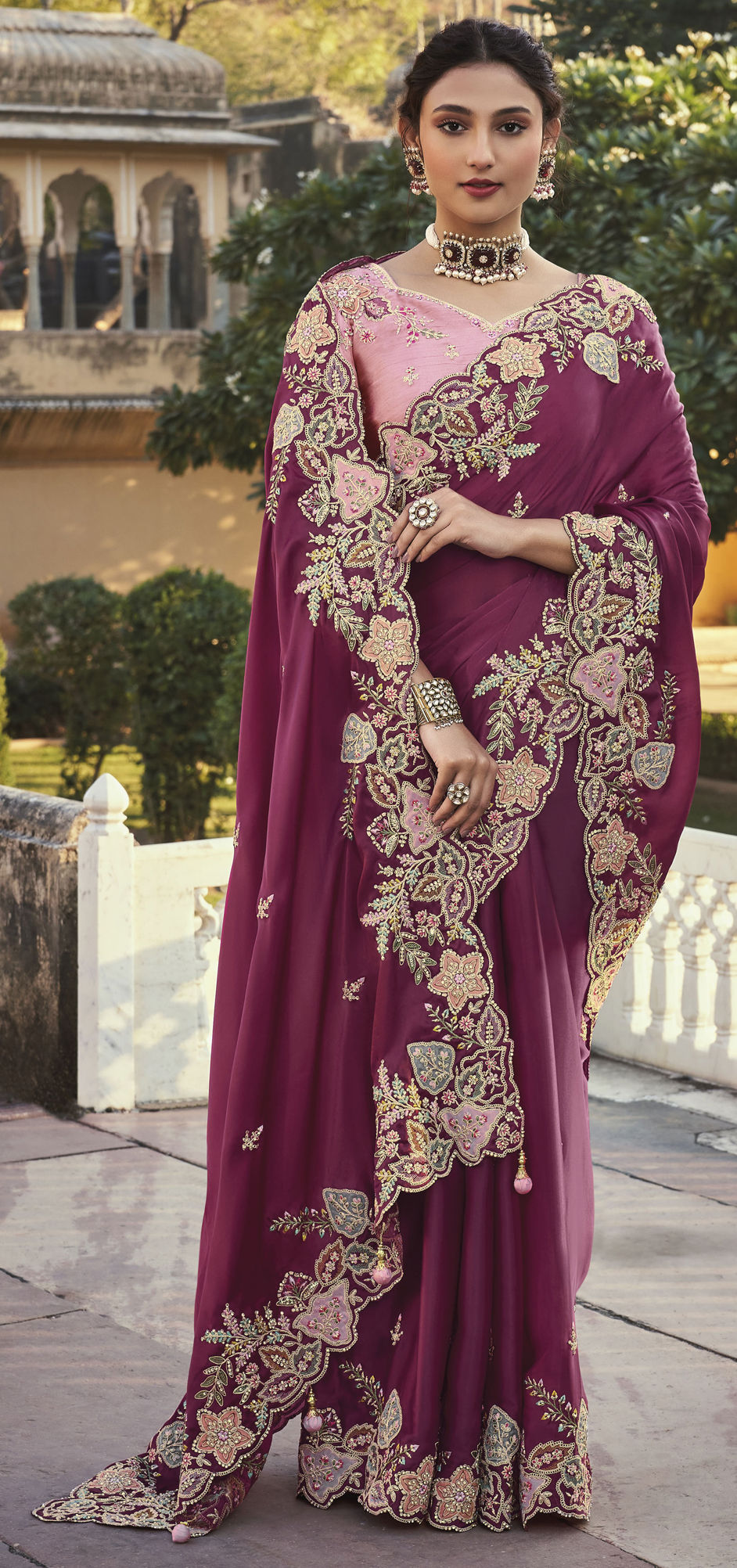 Purple and Violet color Saree in Satin Silk fabric with Embroidered, Sequence, Stone, Thread work