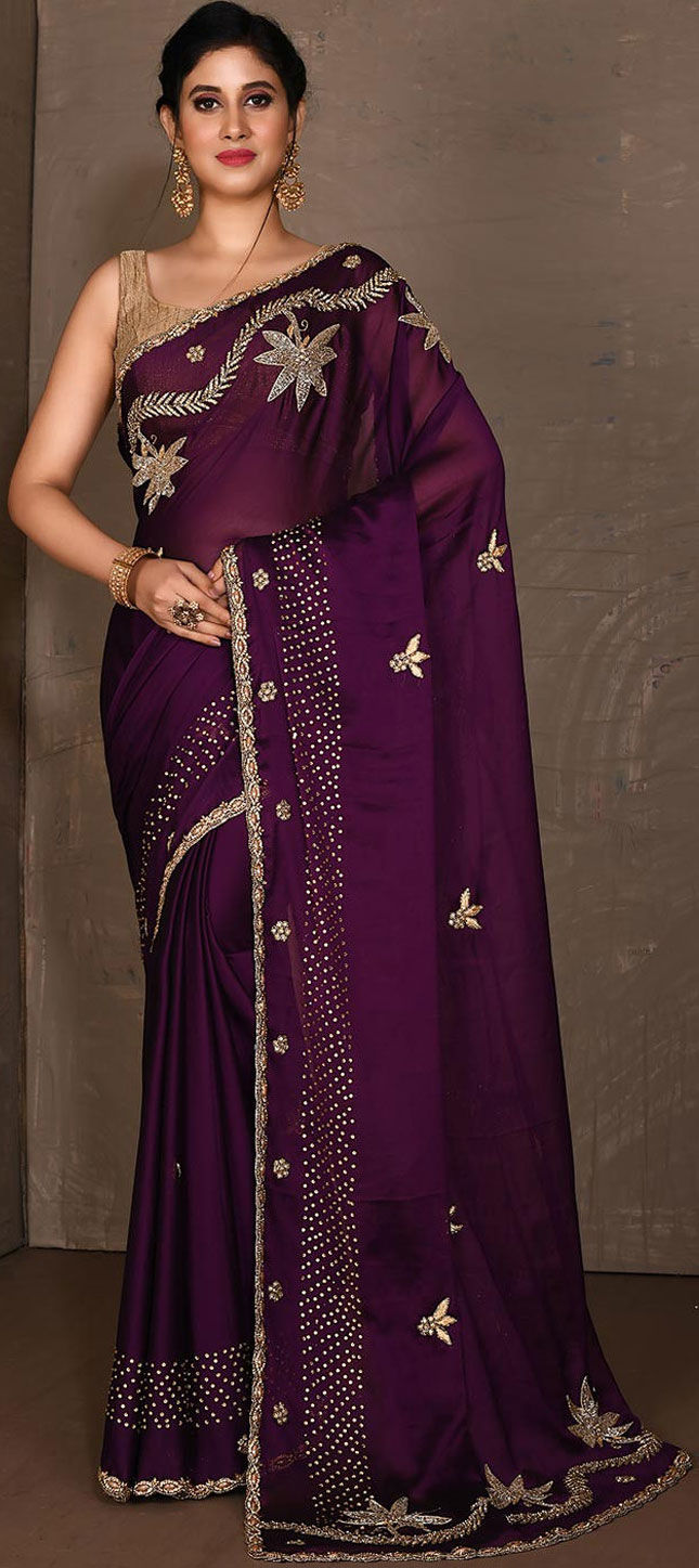 Purple and Violet color Saree in Satin Silk, Silk fabric with Stone, Thread work