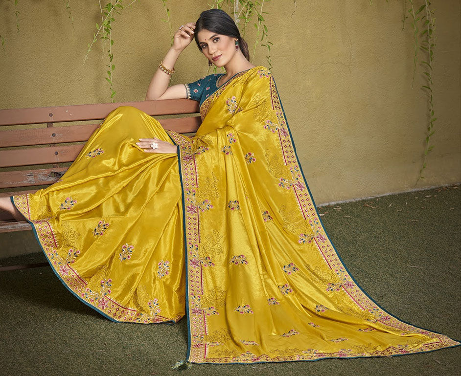 Yellow color Saree in Satin Silk, Silk fabric with Embroidered, Resham, Thread, Zari work