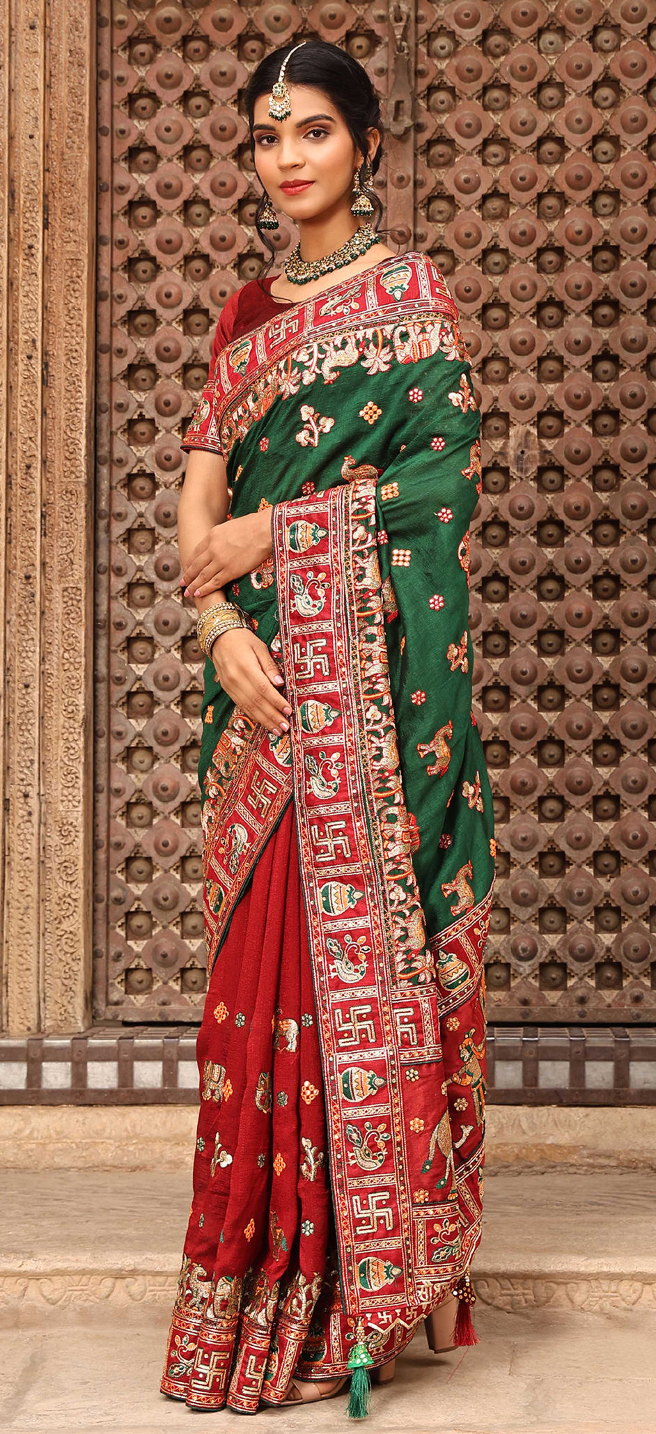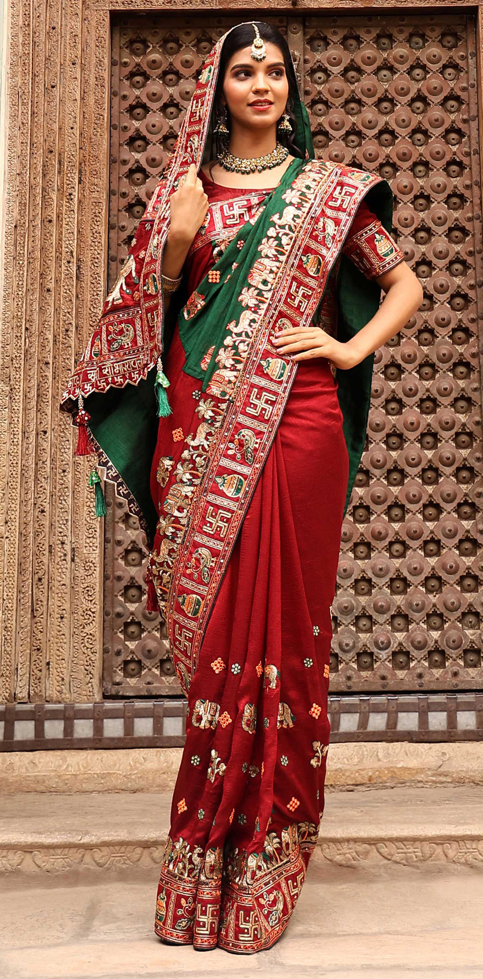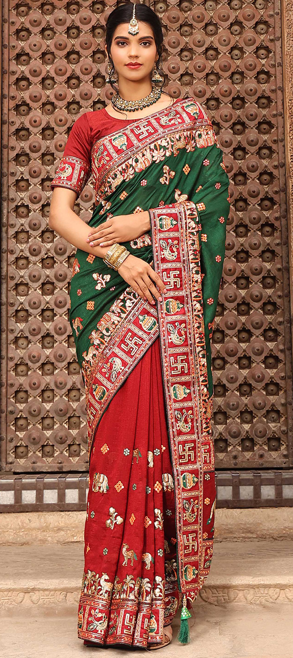 Green, Red and Maroon color Saree in Silk fabric with Embroidered work