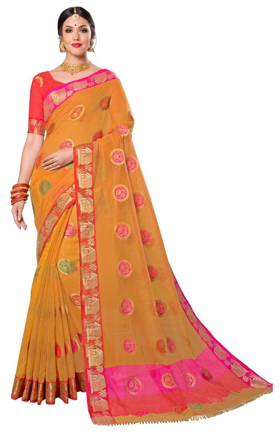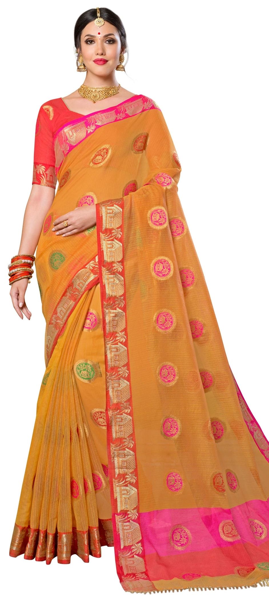 Yellow color Saree in Silk, Silk cotton fabric with Thread work