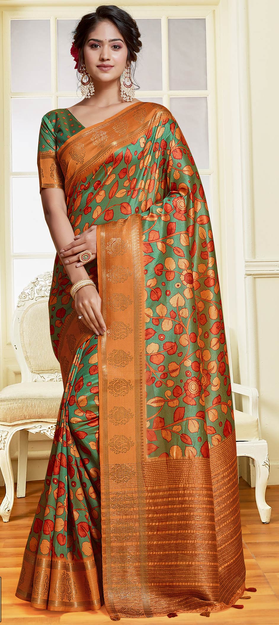 Green color Saree in Silk, Tussar Silk fabric with Digital Print, Weaving work