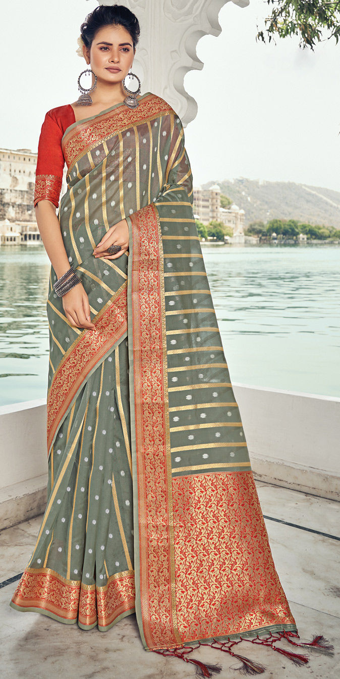 Black and Grey color Saree in Organza Silk, Silk fabric with Weaving work
