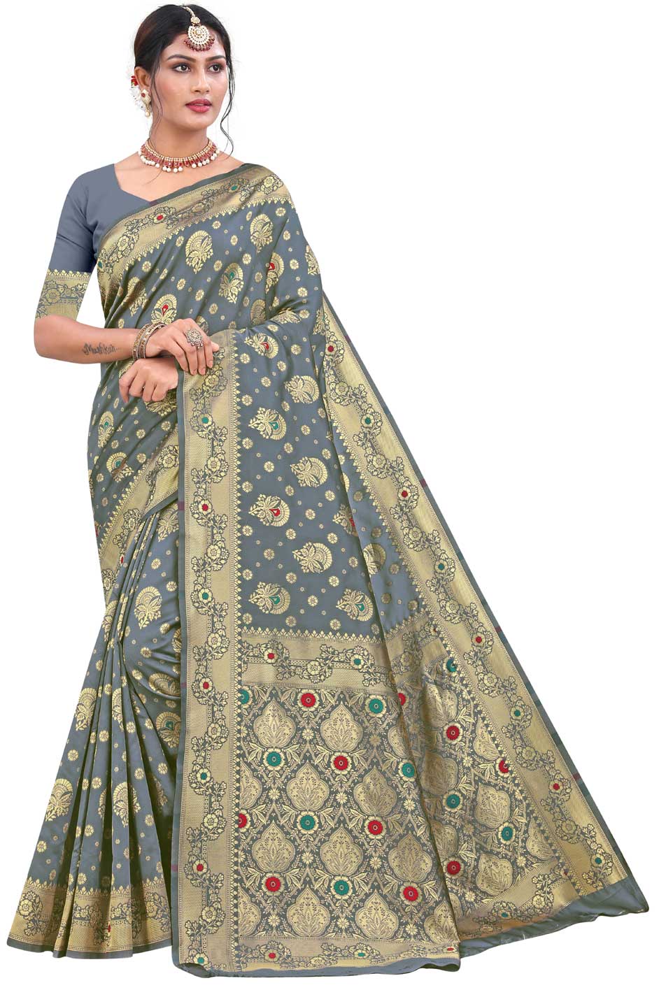 Black and Grey color Saree in Art Silk, Silk fabric with Weaving work