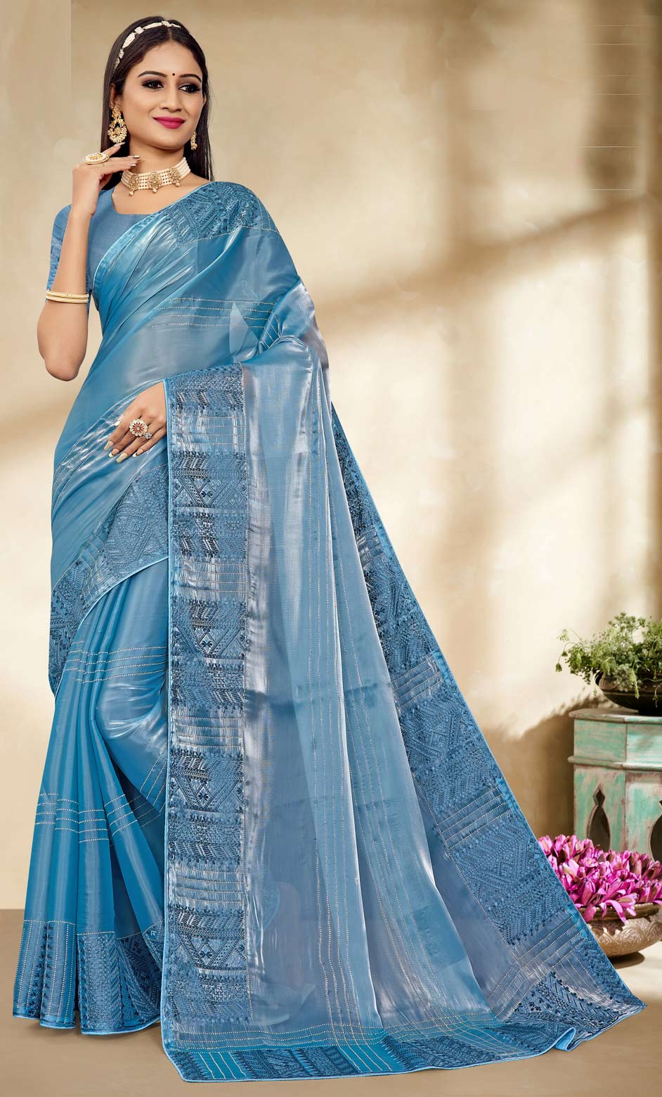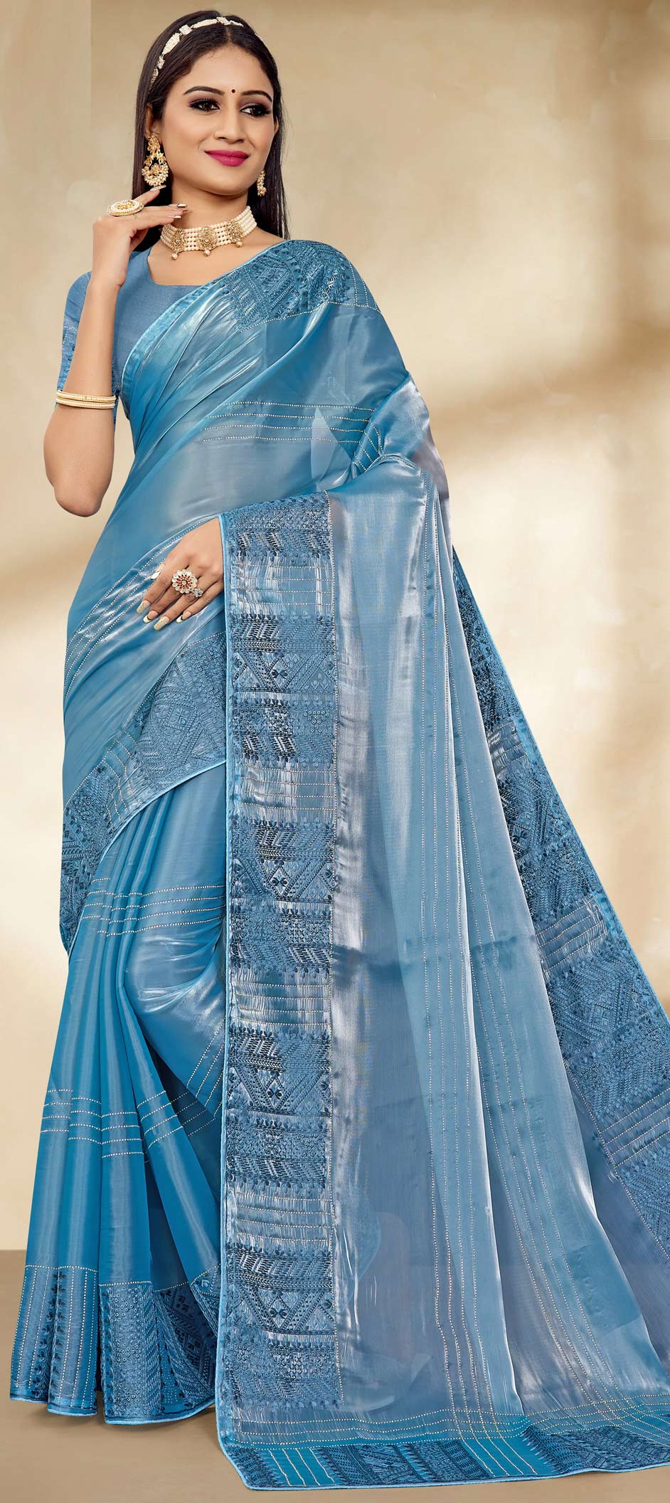 Blue color Saree in Organza Silk, Silk fabric with Embroidered, Resham, Thread work