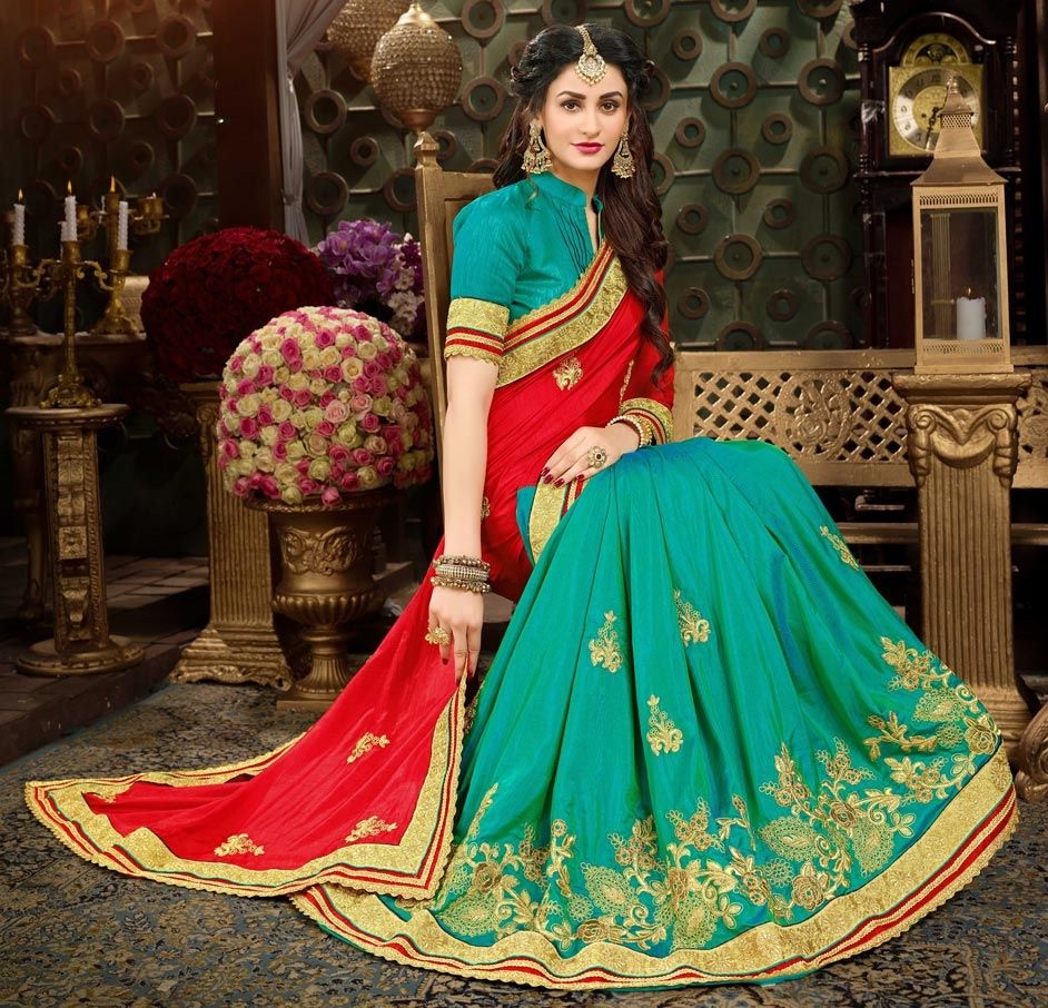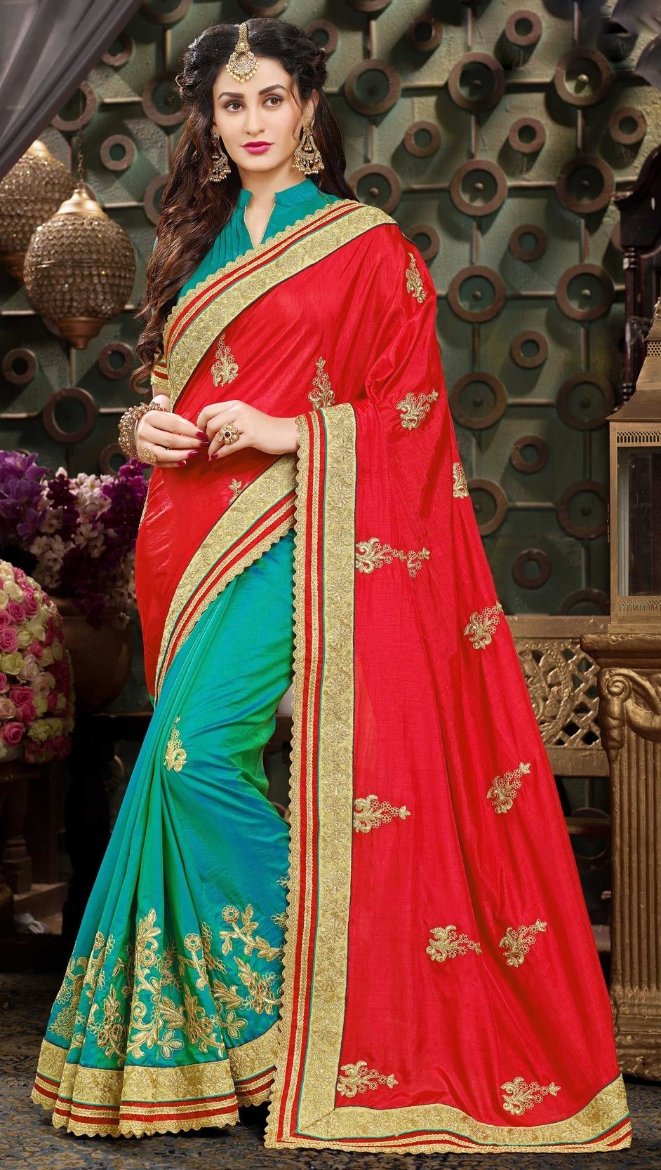 Green, Red and Maroon color Saree in Art Silk fabric with Embroidered, Lace, Thread, Zari work