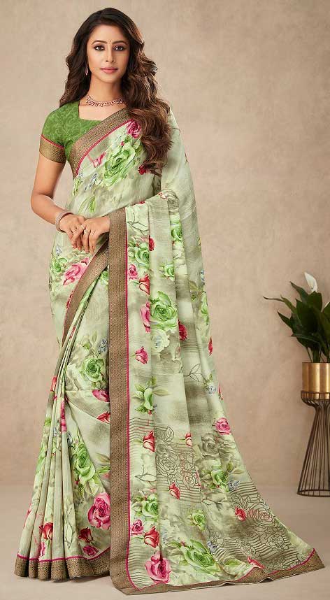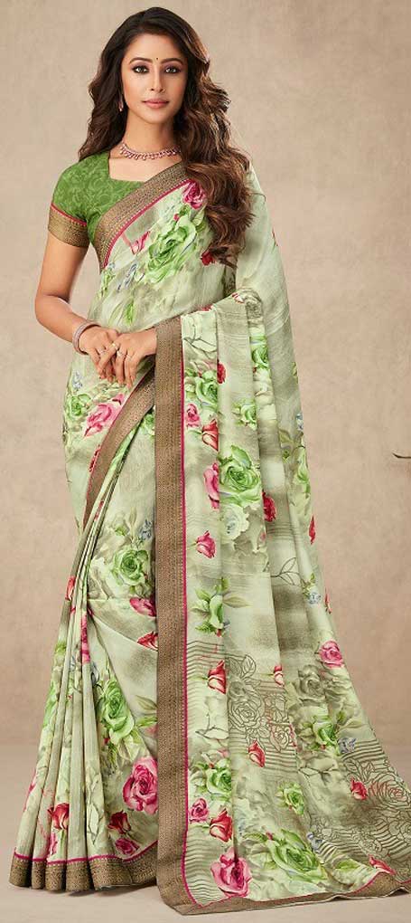 Green color Saree in Crepe Silk, Silk fabric with Floral, Printed work