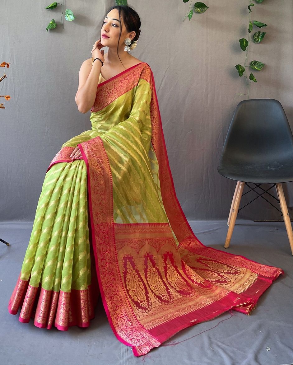 Green color Saree in Organza Silk, Silk fabric with Weaving work