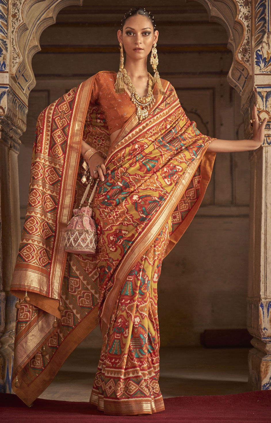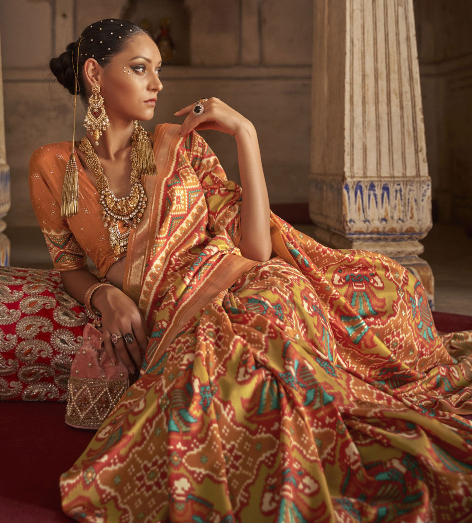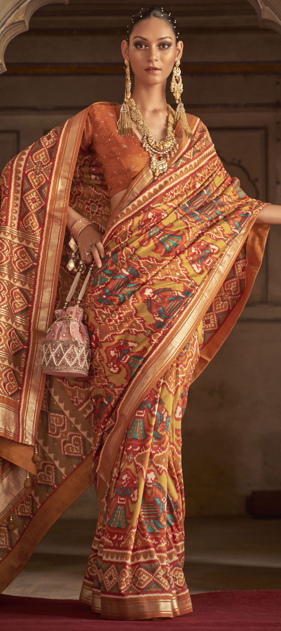 Orange color Saree in Patola Silk, Silk fabric with Stone work