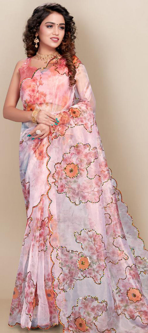 Pink and Majenta color Saree in Organza Silk, Silk fabric with Digital Print, Floral, Sequence work