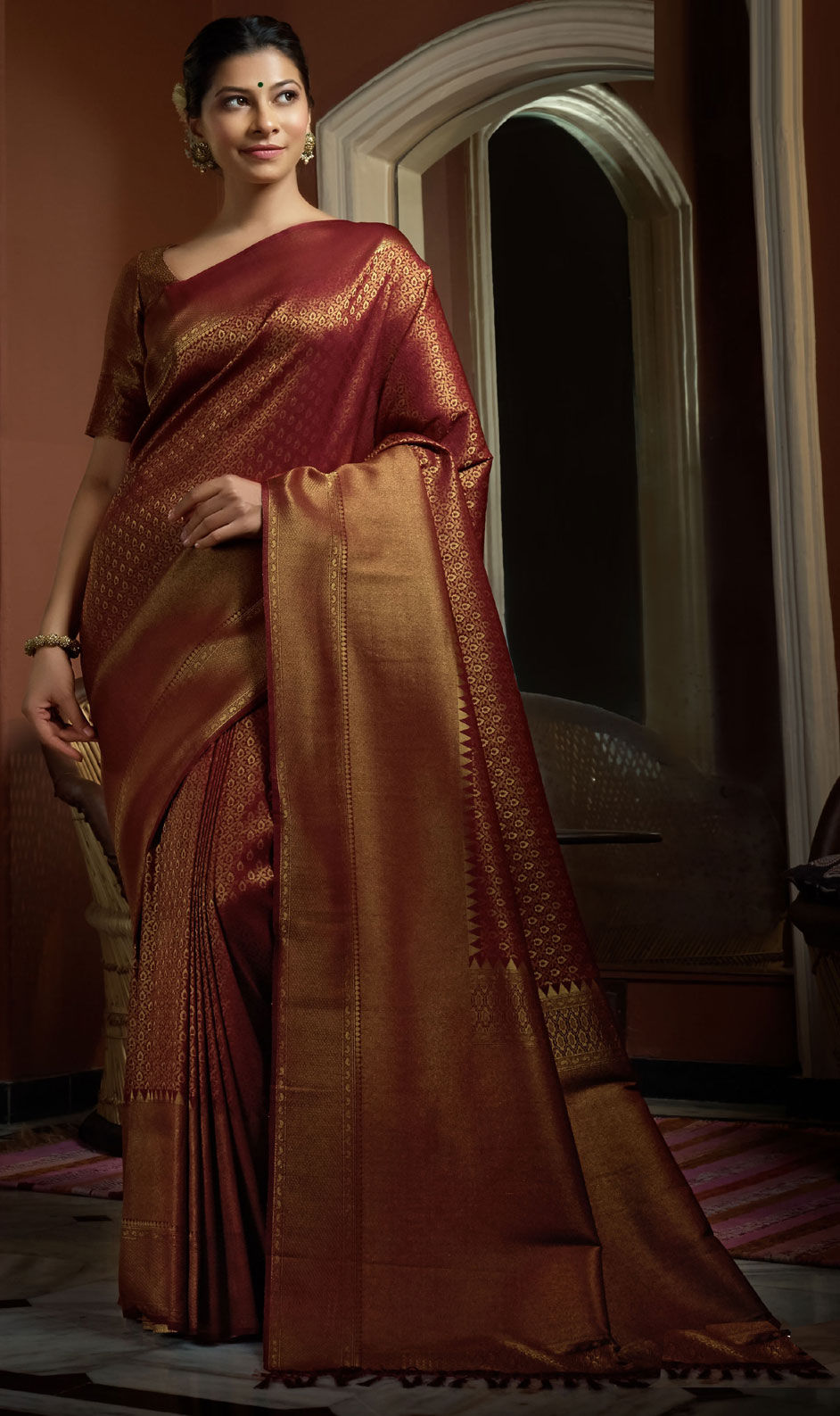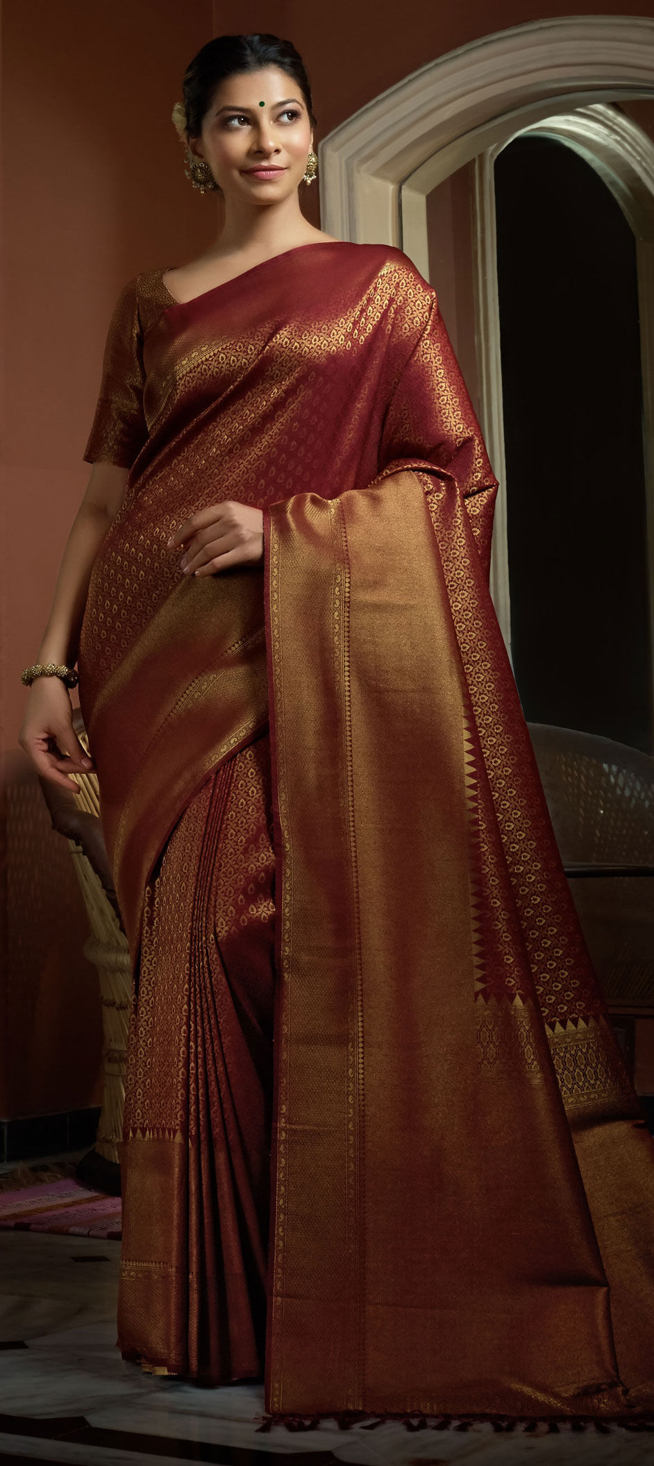 Red and Maroon color Saree in Art Silk, Silk fabric with Weaving work