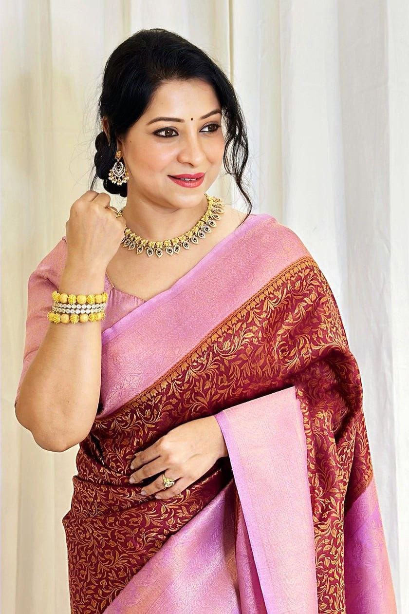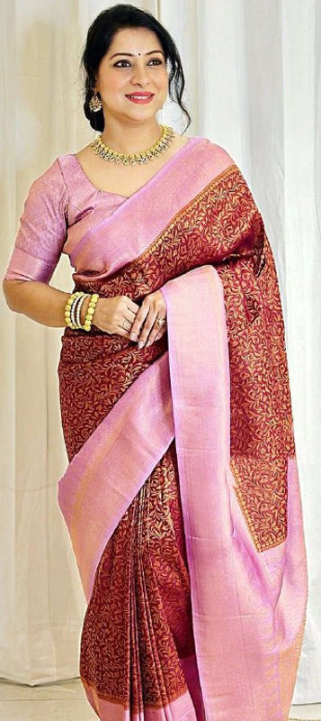 Red and Maroon color Saree in Litchi Silk, Silk fabric with Weaving work