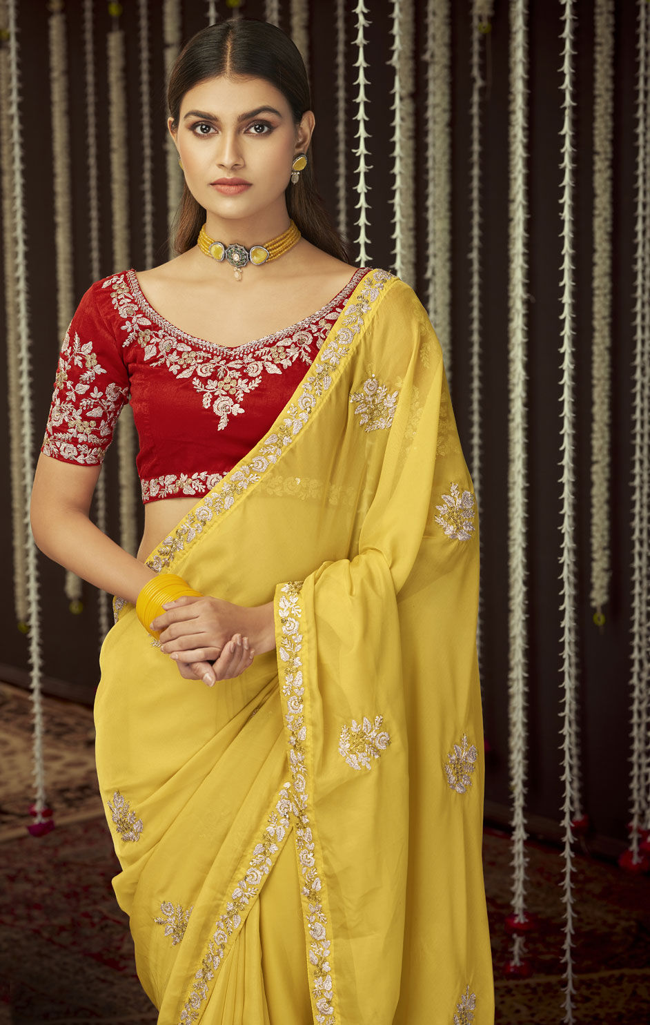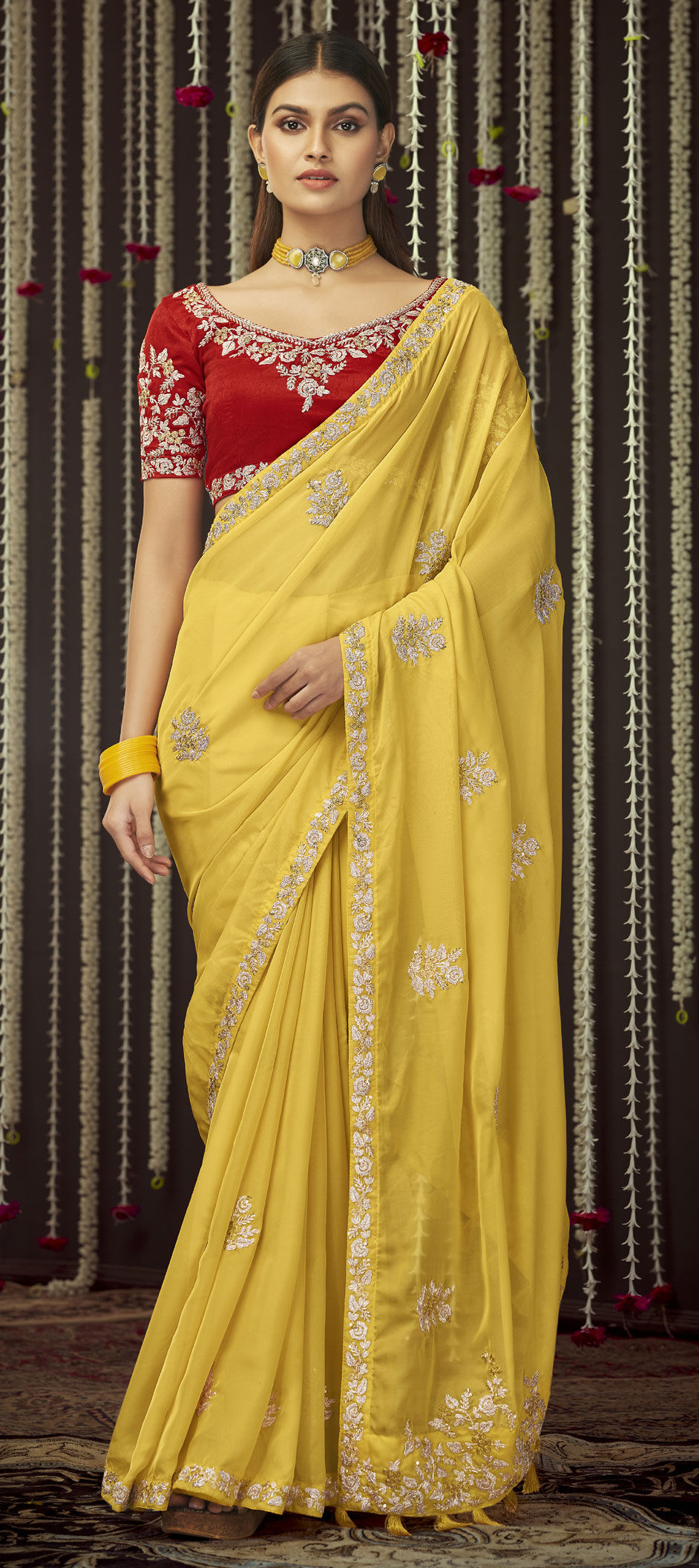 Yellow color Saree in Organza Silk, Silk fabric with Sequence, Thread work