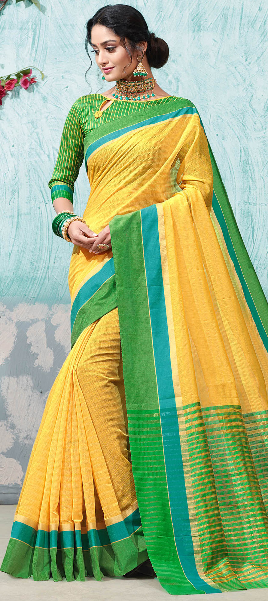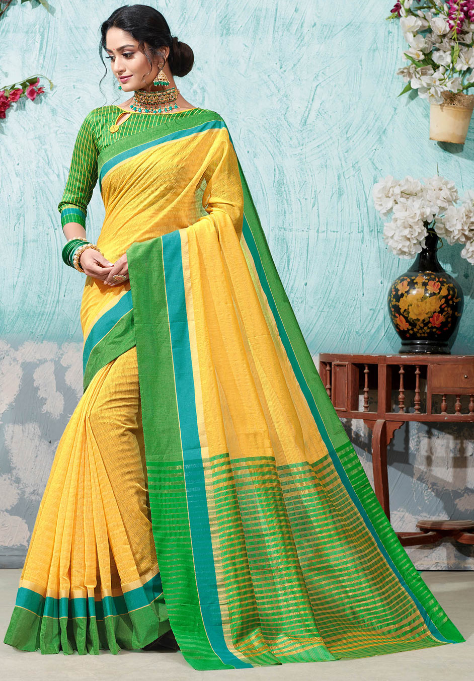 Yellow color Saree in Silk, Silk cotton fabric with Weaving work