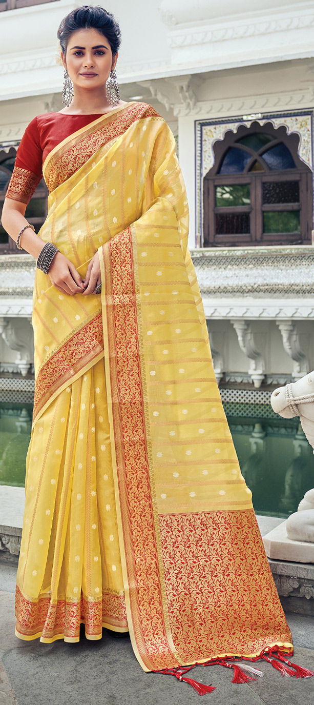 Yellow color Saree in Organza Silk, Silk fabric with Weaving work