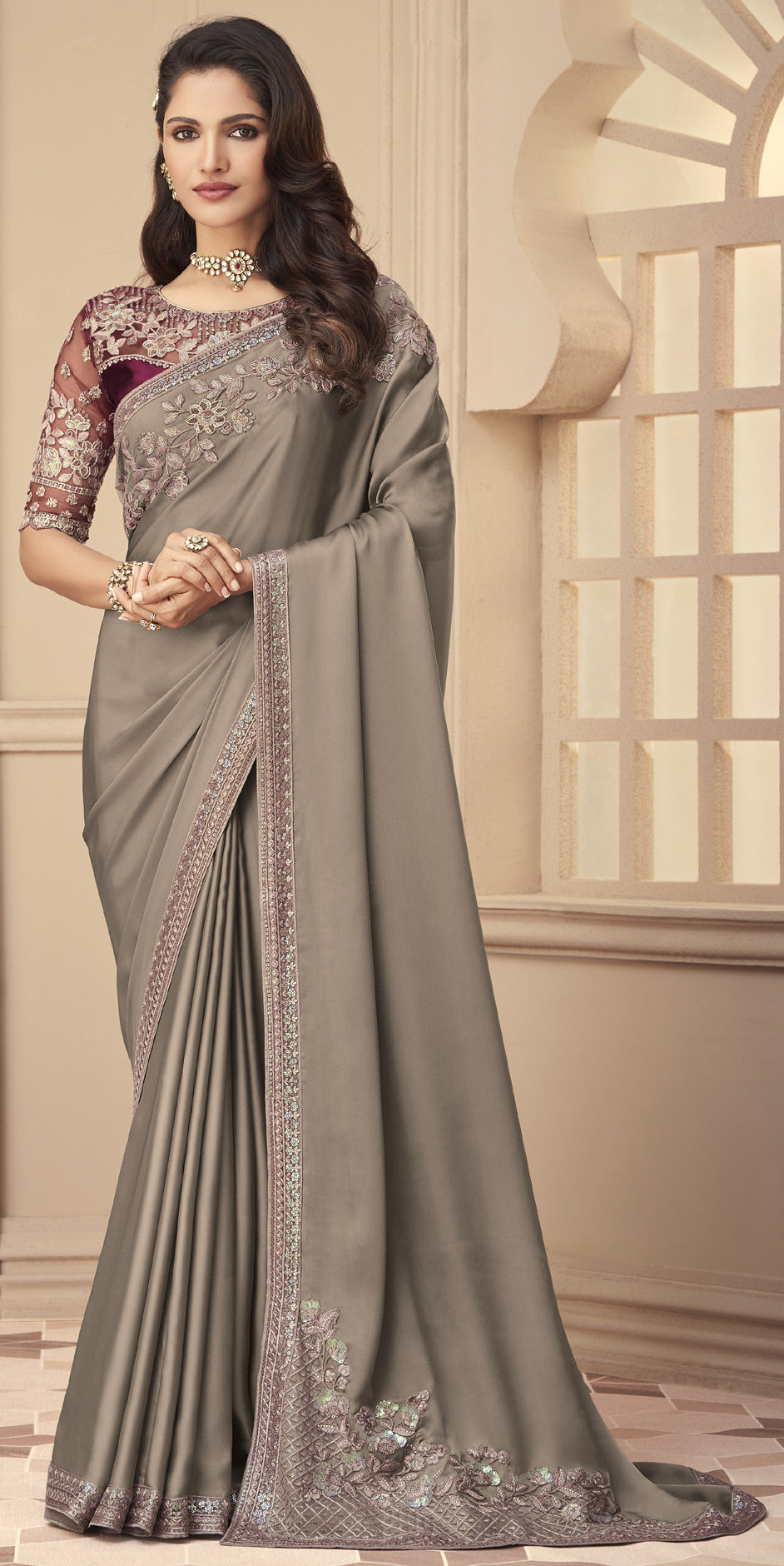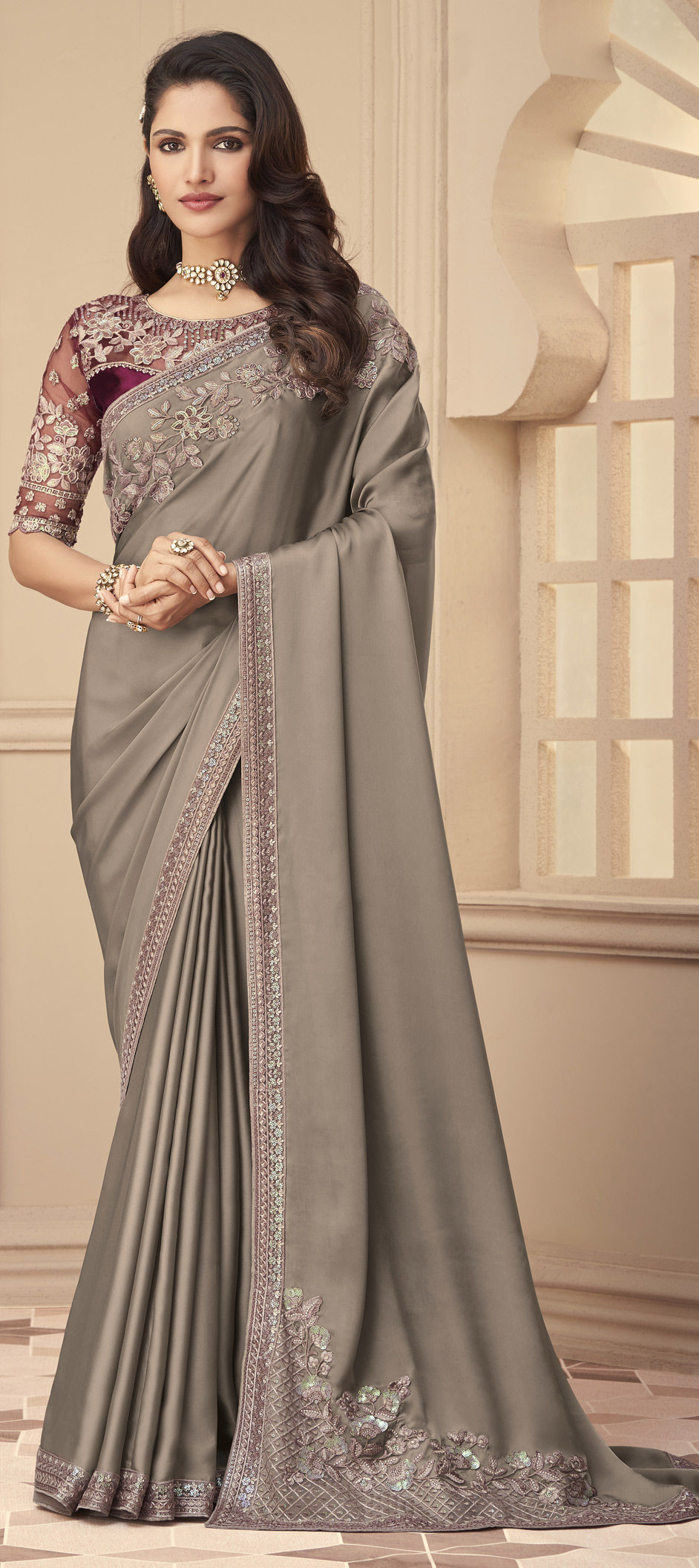 Black and Grey color Saree in Satin Silk, Silk fabric with Embroidered, Sequence, Thread work