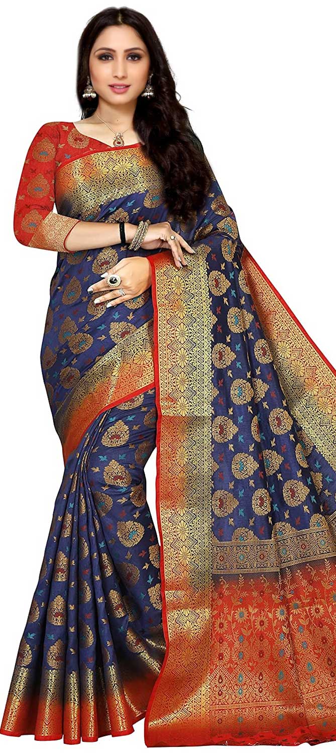 Blue color Saree in Kanchipuram Silk, Silk fabric with Weaving work