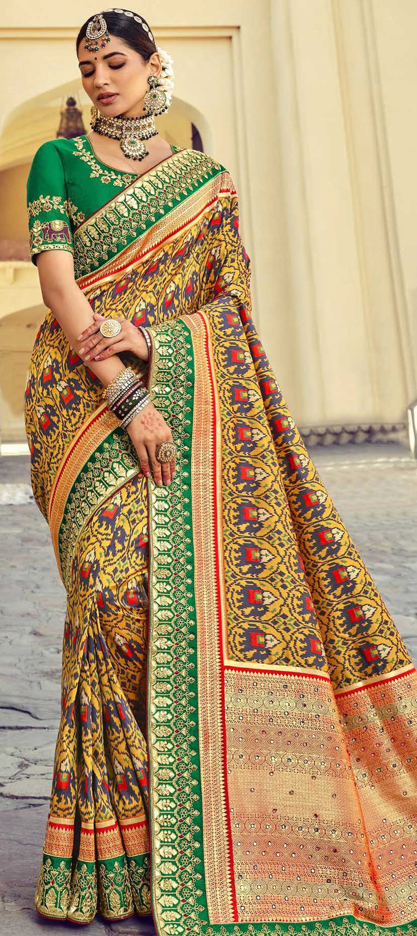 Multicolor color Saree in Patola Silk, Silk fabric with Border, Embroidered, Mirror work