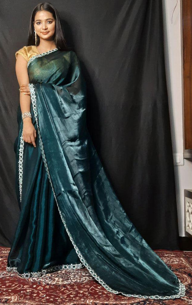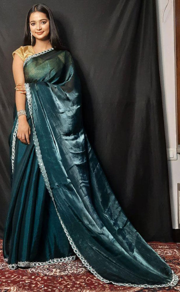 Green color Saree in Silk, Tissue fabric with Cut Dana work