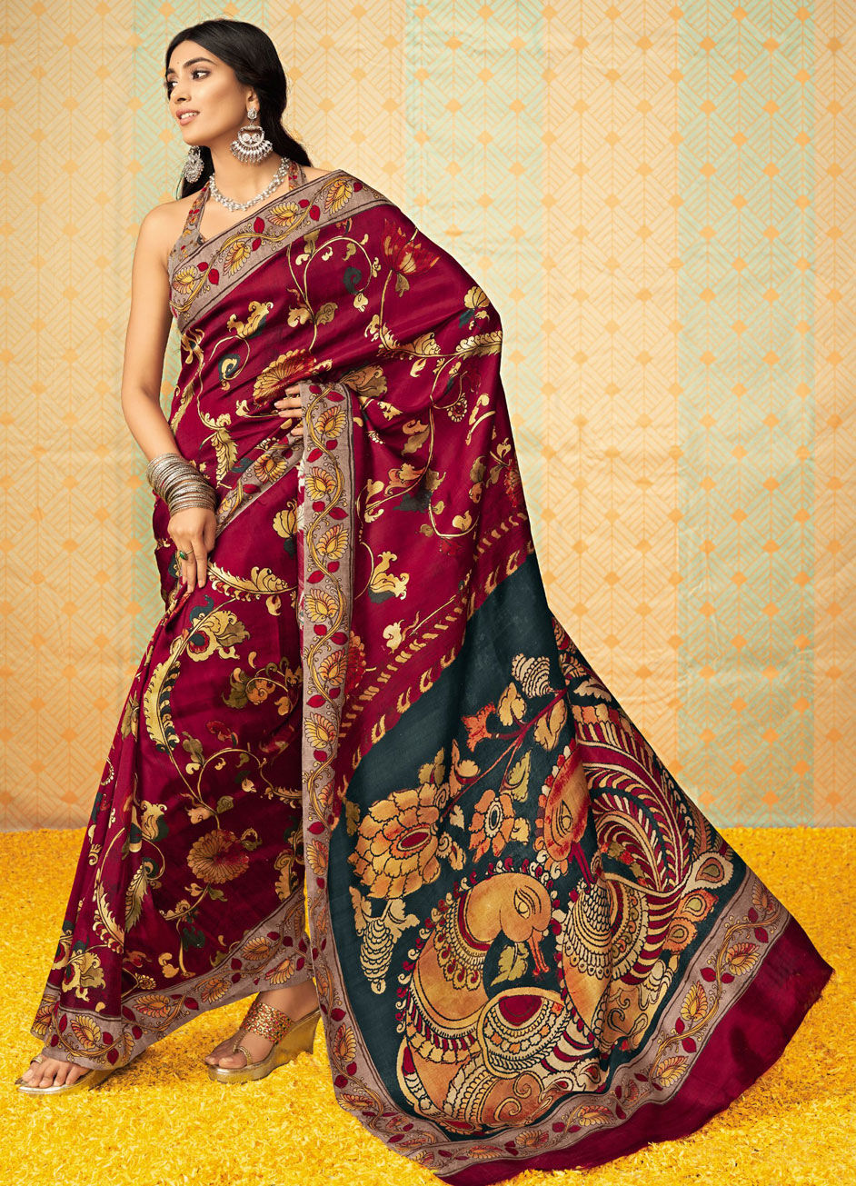 Red and Maroon color Saree in Tussar Silk fabric with Printed work