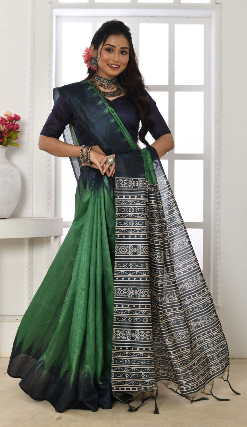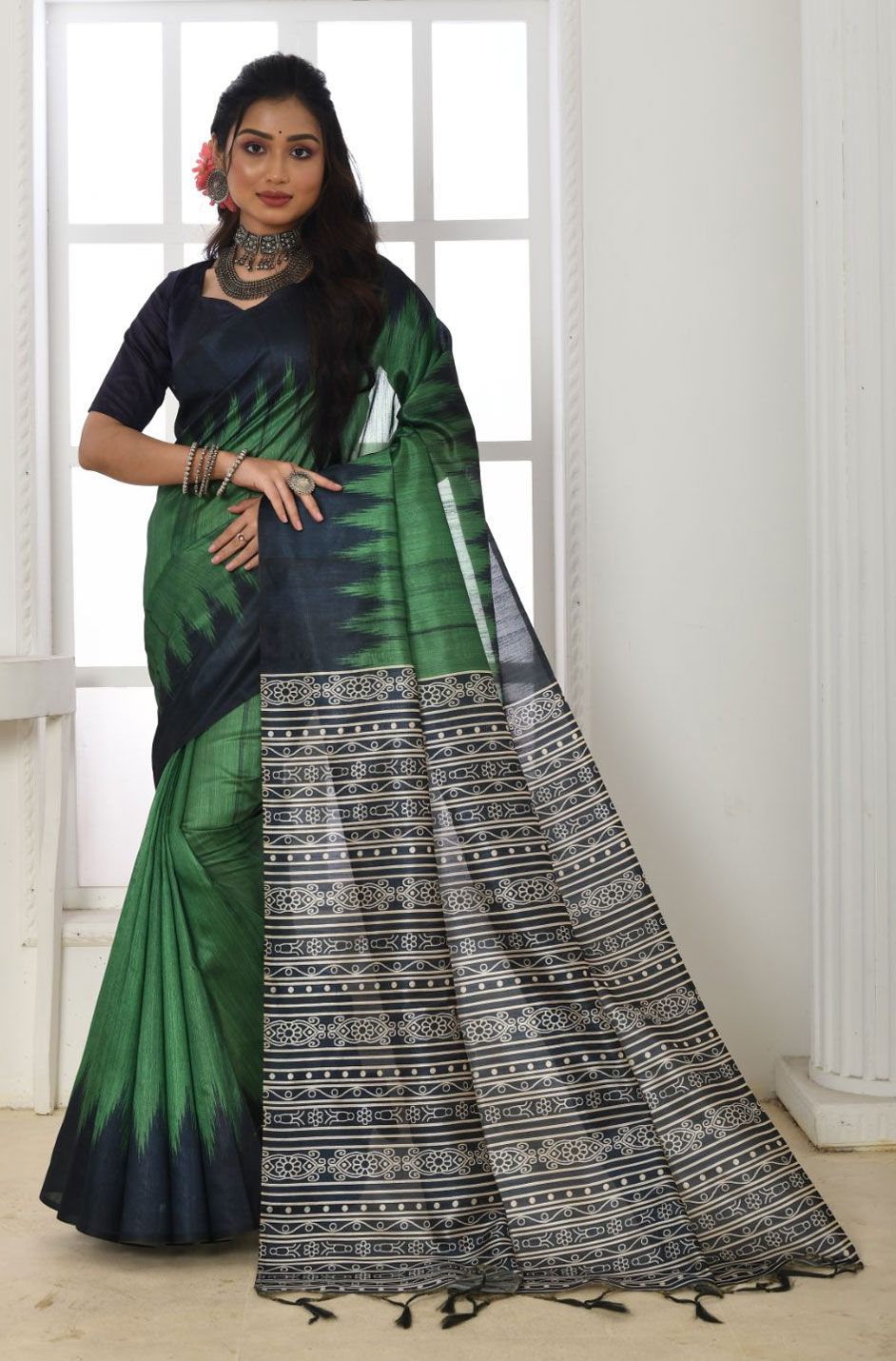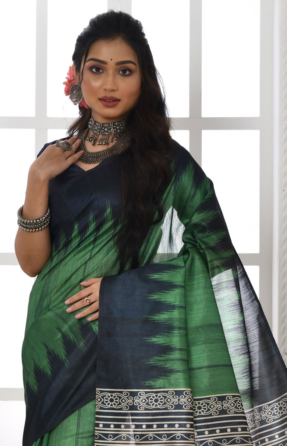 Green color Saree in Silk, Tussar Silk fabric with Printed work