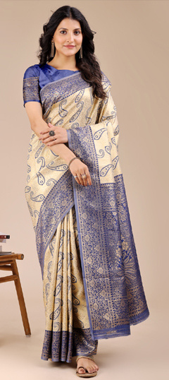 Beige and Brown, Blue color Saree in Banarasi Silk fabric with Weaving work
