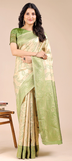 Beige and Brown, Green color Saree in Banarasi Silk fabric with Weaving work