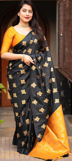 Black and Grey color Saree in Chanderi Silk fabric with Printed, Weaving, Zari work