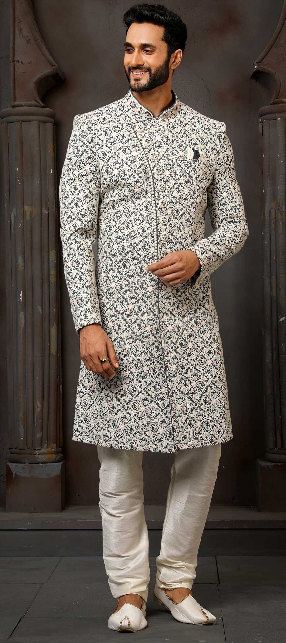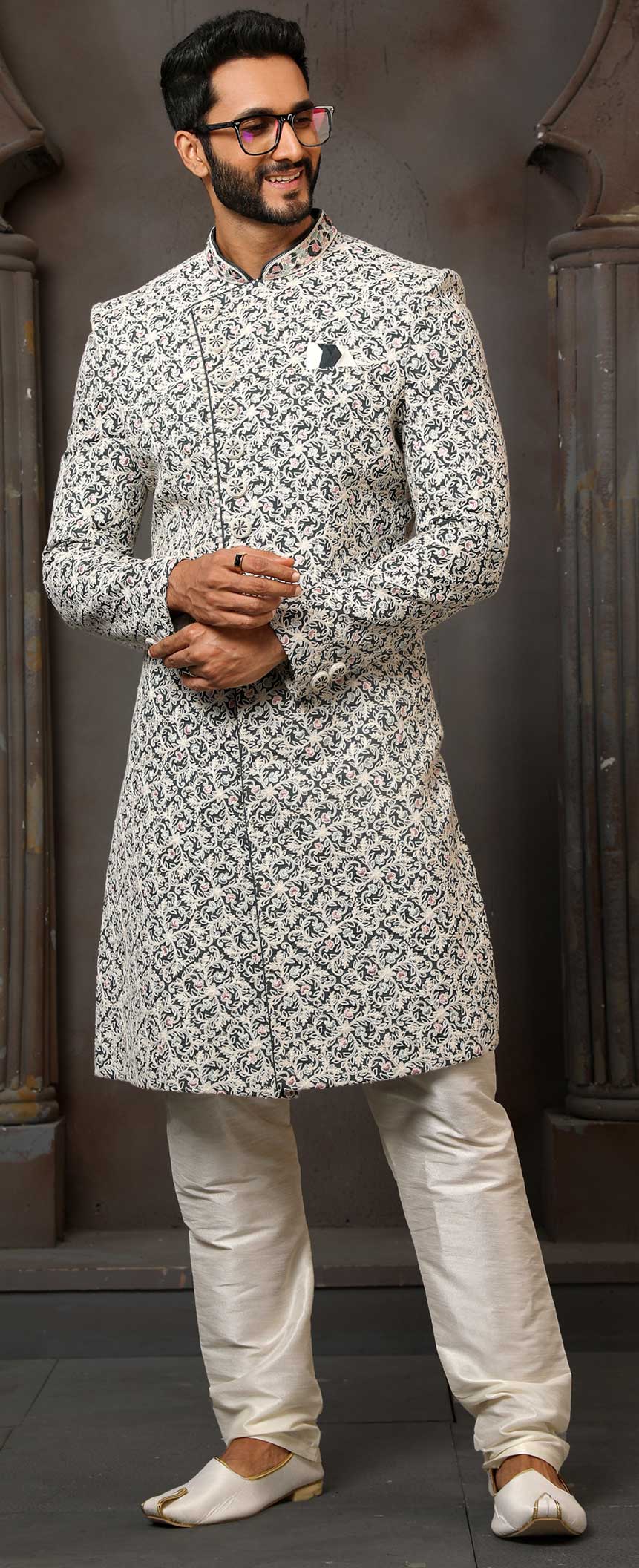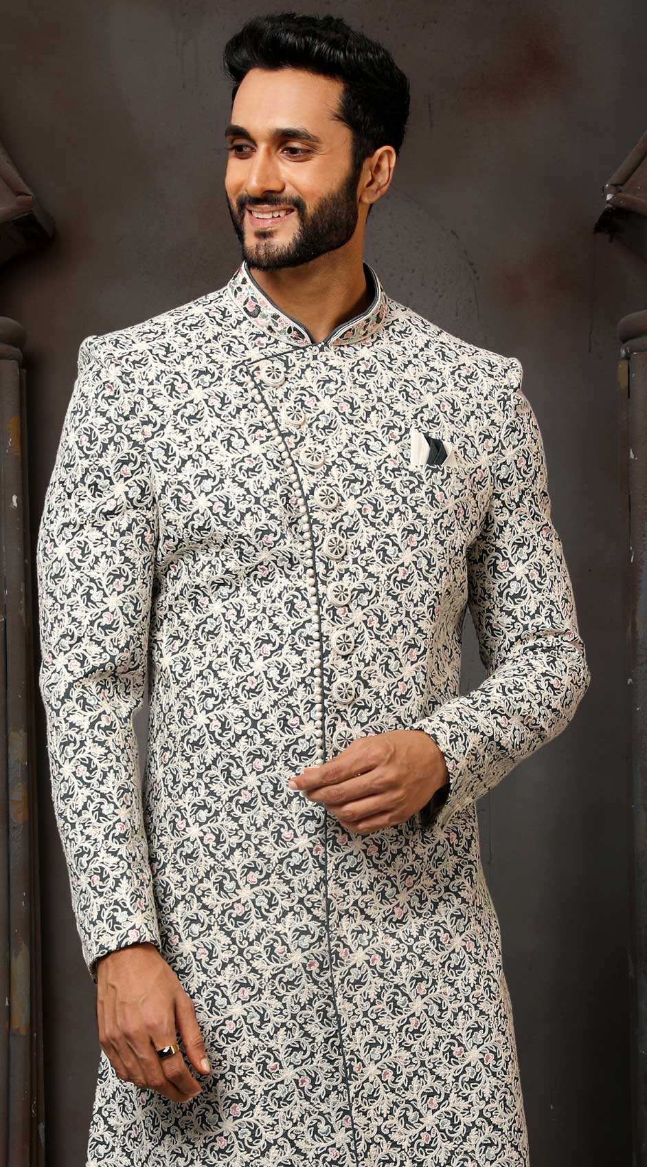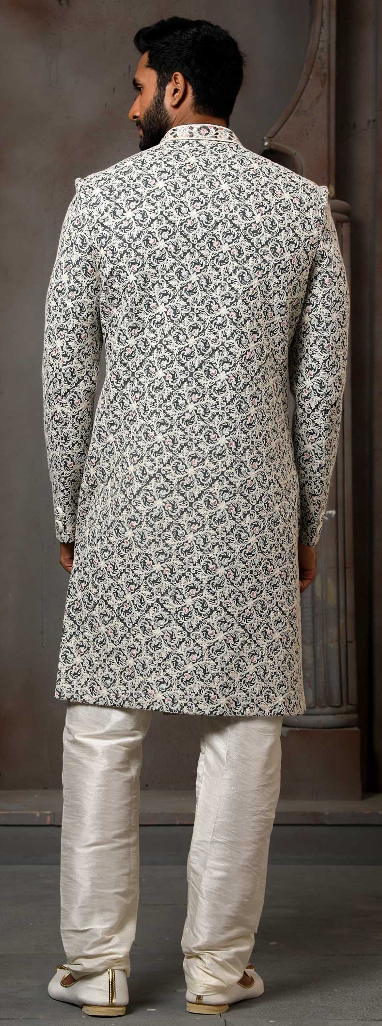 Black and Grey color Sherwani in Art Silk fabric with Embroidered, Thread work