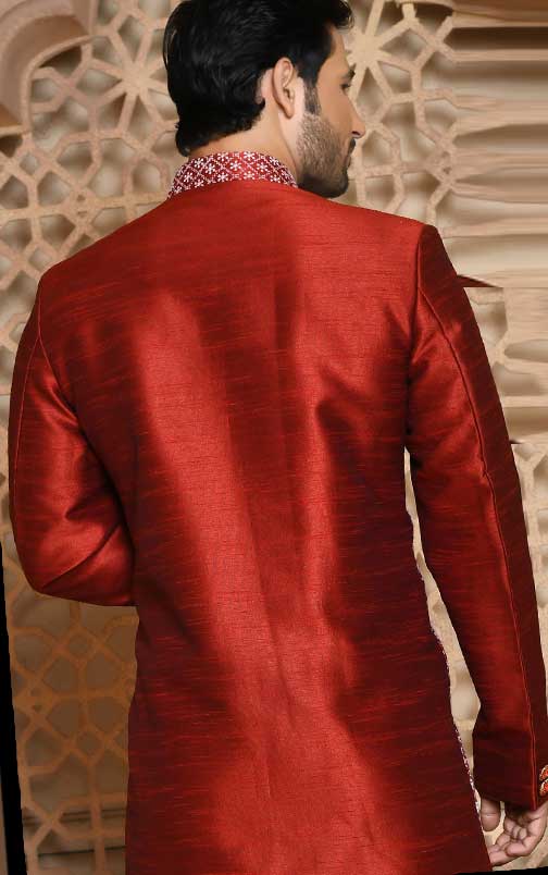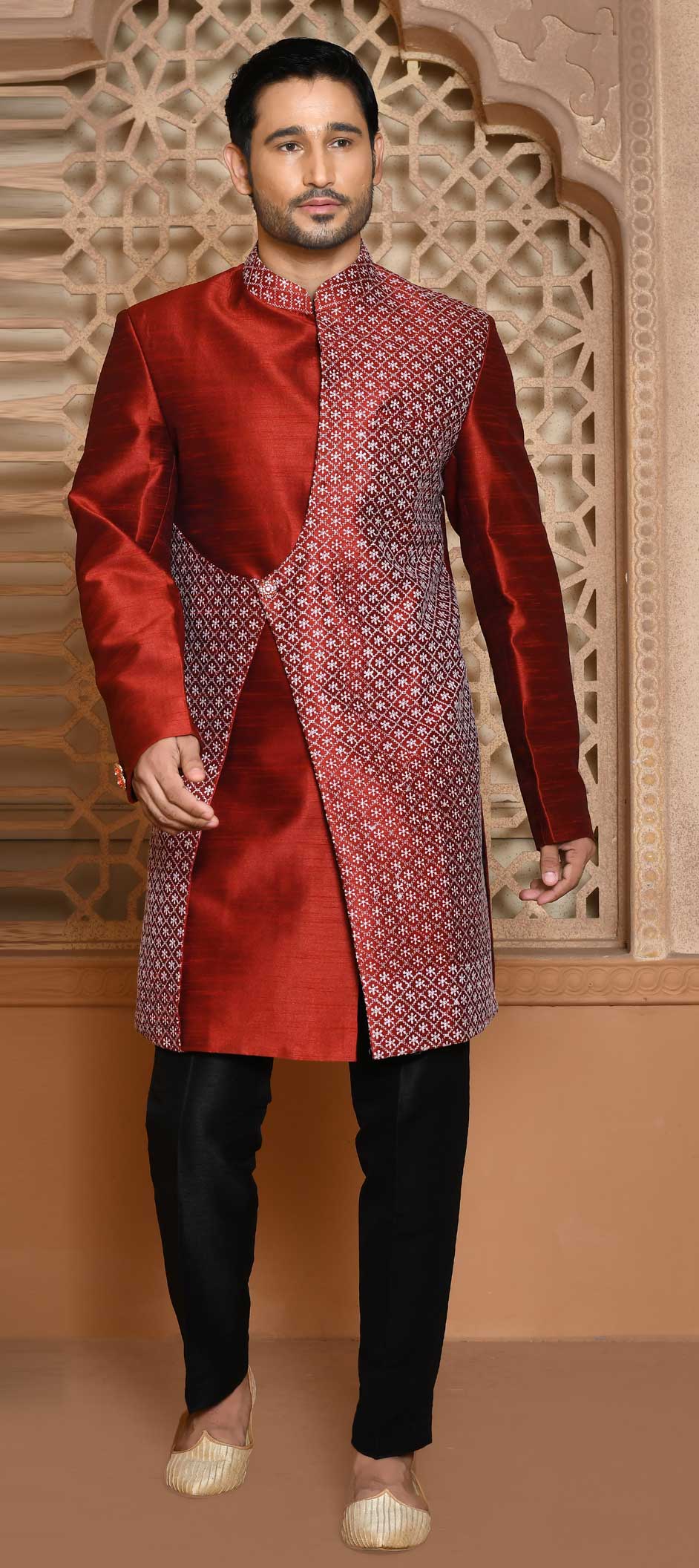 Red and Maroon color Sherwani in Banarasi Silk fabric with Thread work