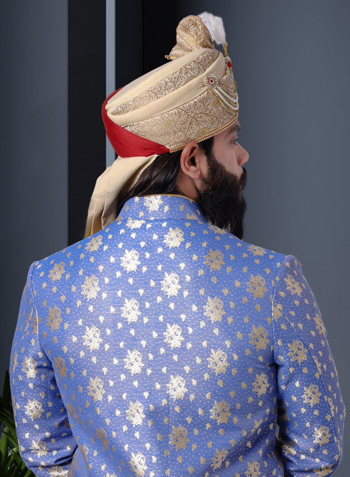 Blue color Sherwani in Jacquard fabric with Weaving work