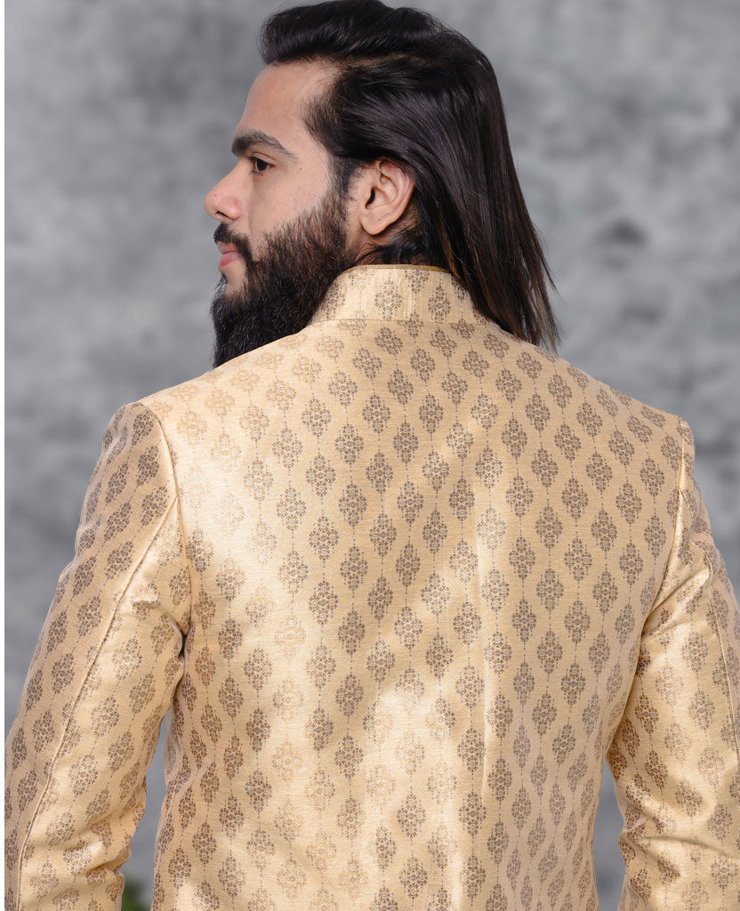 Gold color Sherwani in Jacquard fabric with Weaving work
