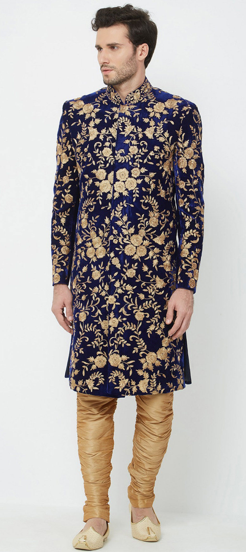 Blue color Sherwani in Velvet fabric with Embroidered, Thread, Zari work