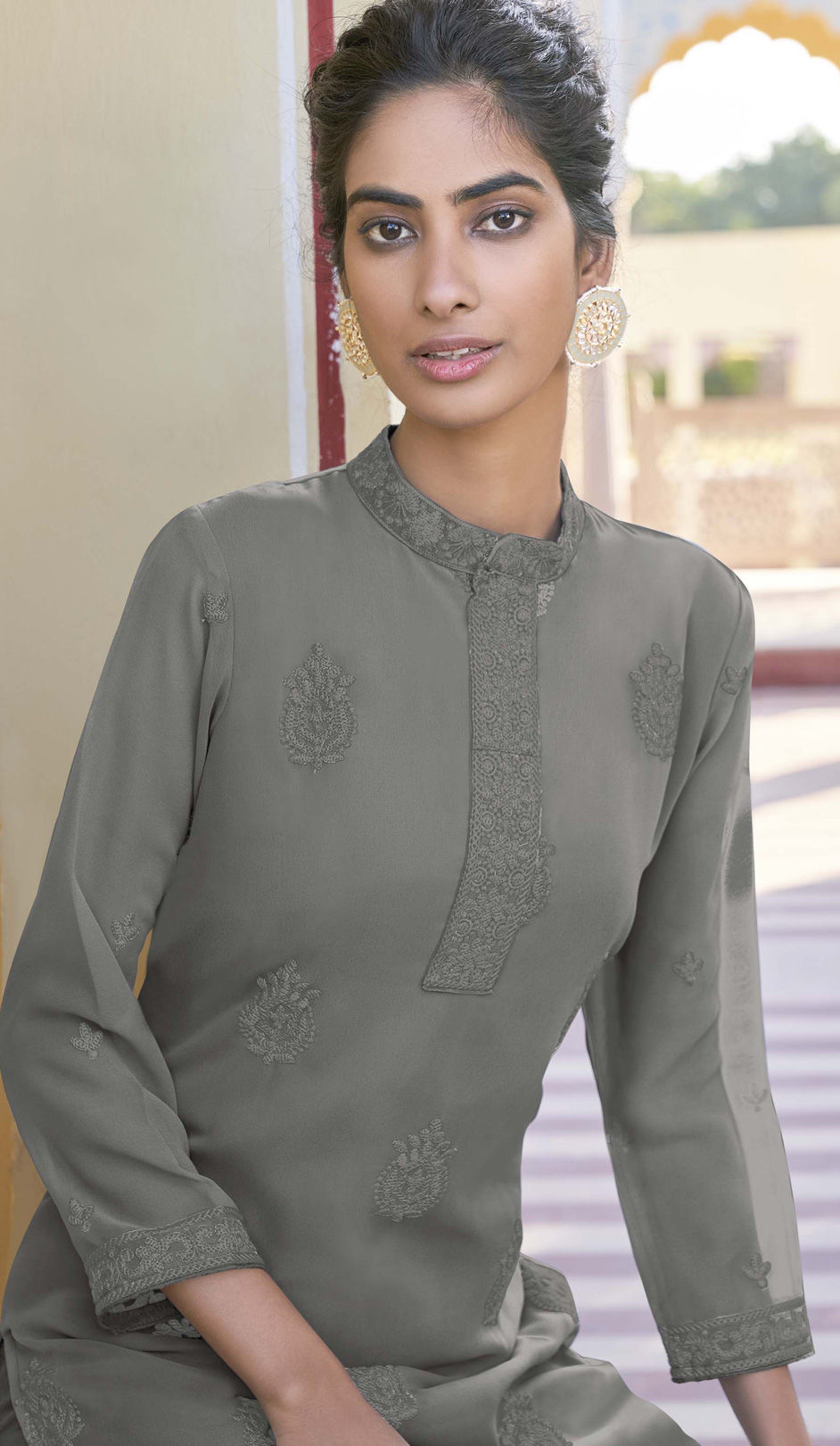 Black and Grey color Tunic with Bottom in Georgette fabric with Embroidered, Thread work
