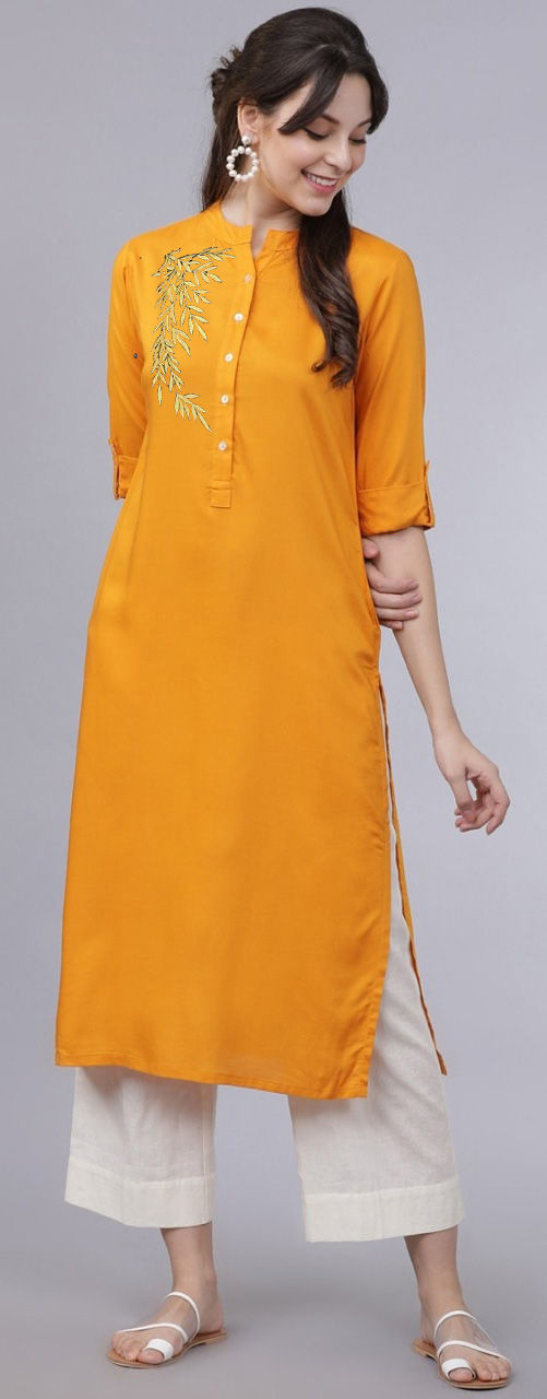 Yellow color Tunic with Bottom in Rayon fabric with Embroidered work