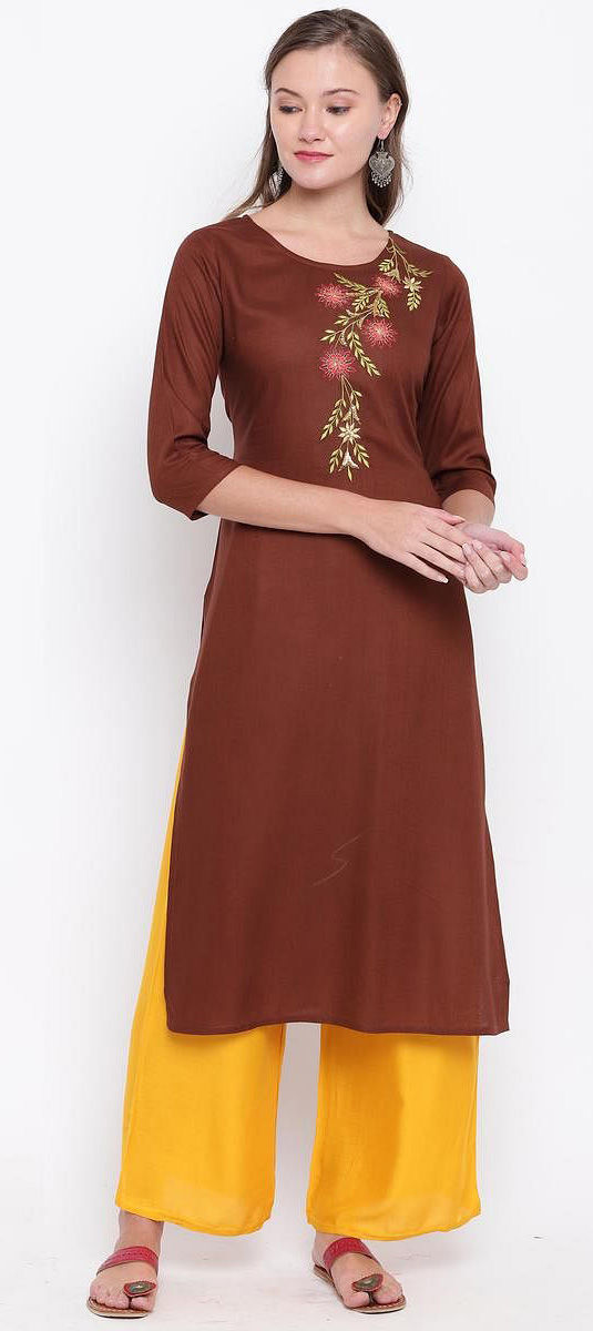 Beige and Brown color Tunic with Bottom in Rayon fabric with Embroidered, Thread work