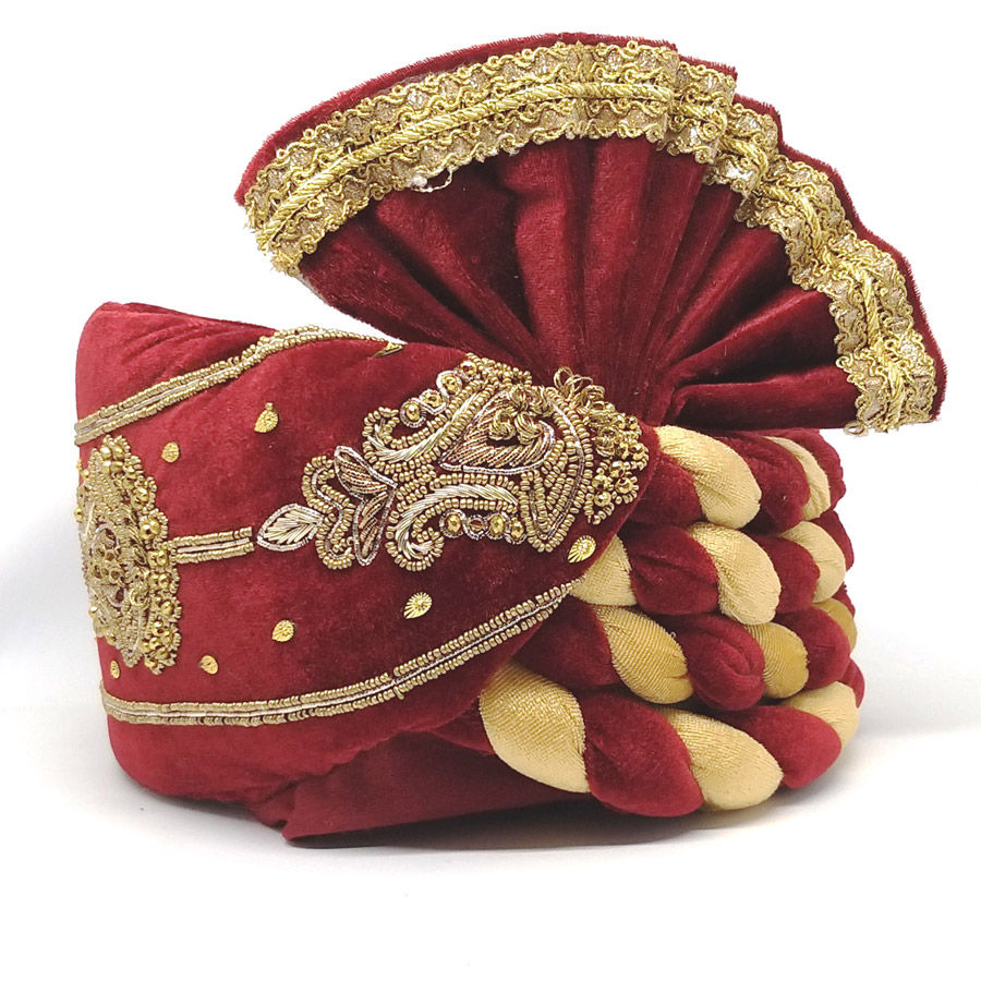 Red and Maroon color Turban in Velvet fabric with Bugle Beads, Zardozi work